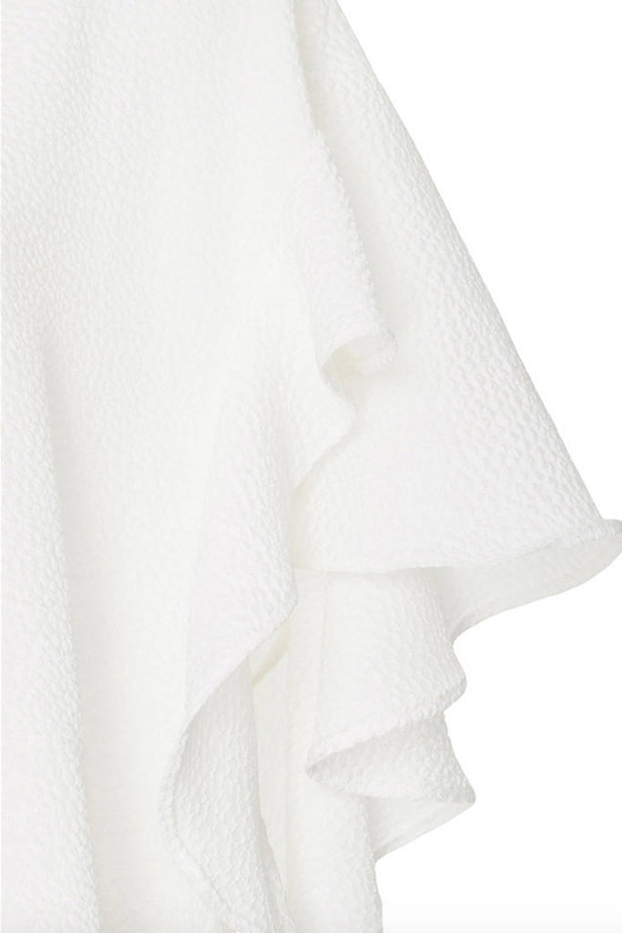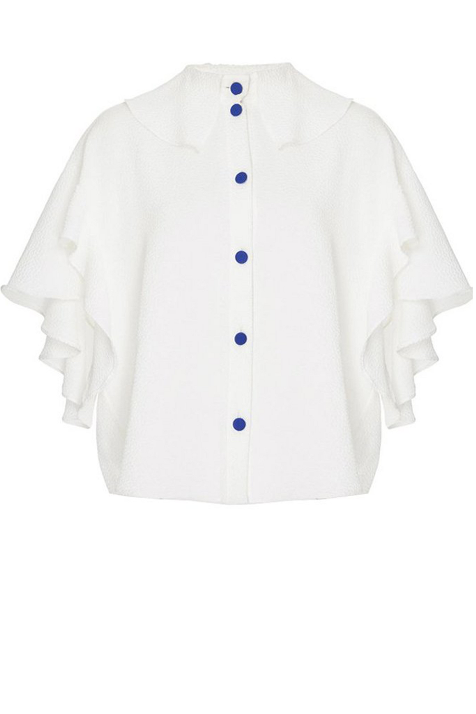 Details include Italian fabric-covered Cobalt Blue buttons, a gracefully flared ruffle that forms a short sleeve, and a flared collar. The elegant weight of the fabric allows the Absurd Top to flow around your arms as you walk.