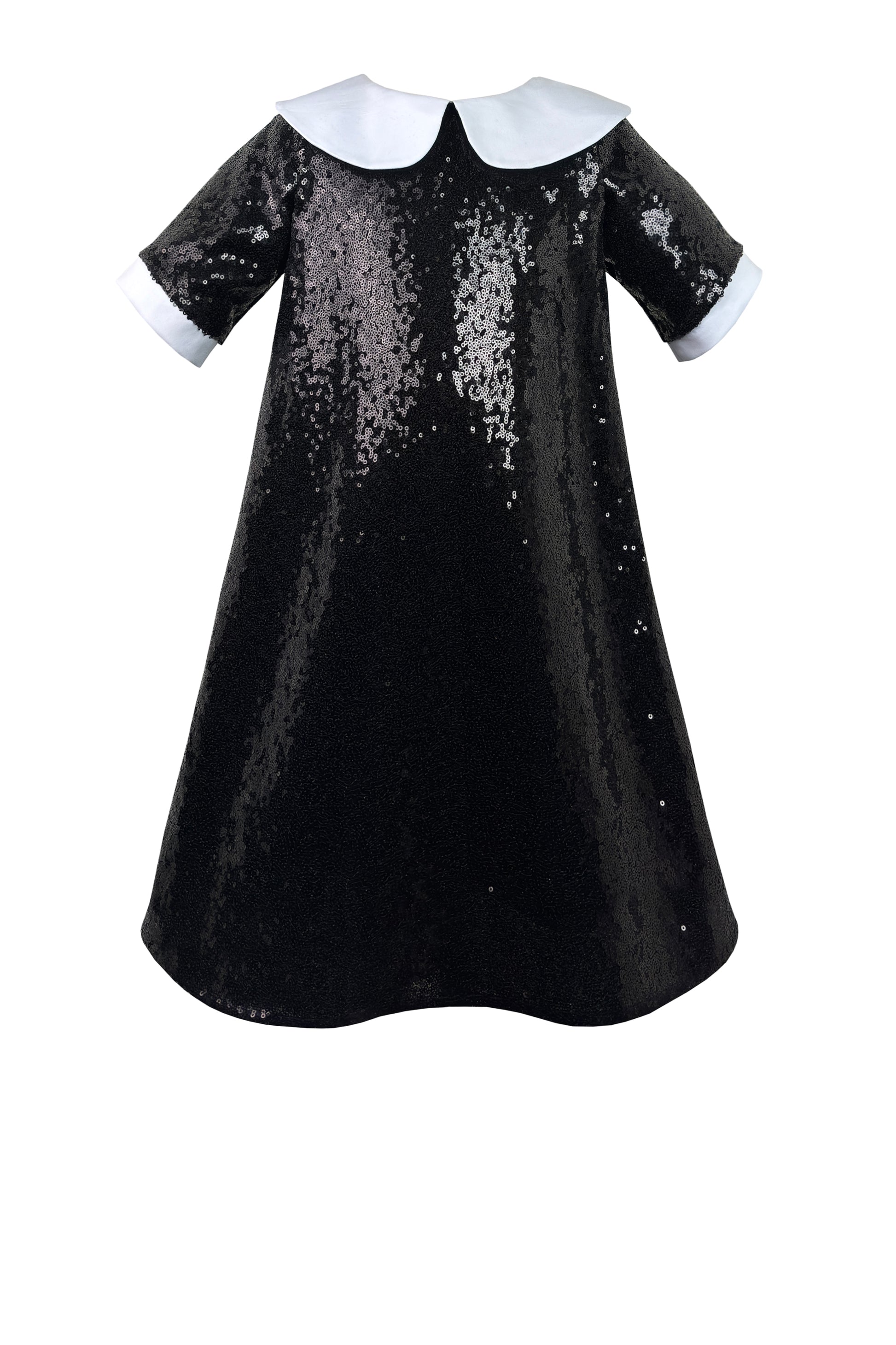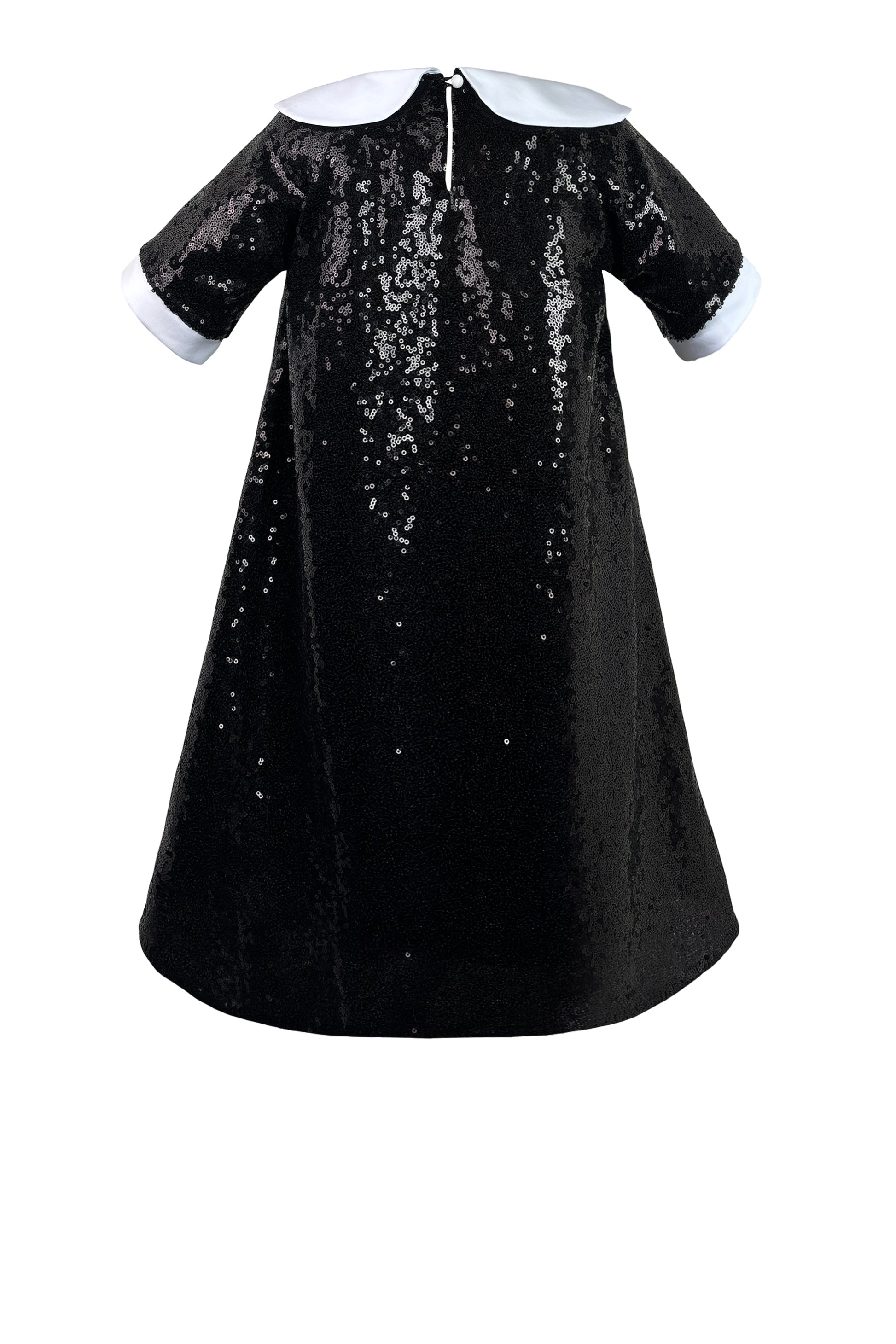 The Alice Dress is hand-crafted in England from a fully lined embroidered net with cluster sequin appliqué. The collar is fashioned from a crisp, lightweight Cotton Poplin woven in Italy.