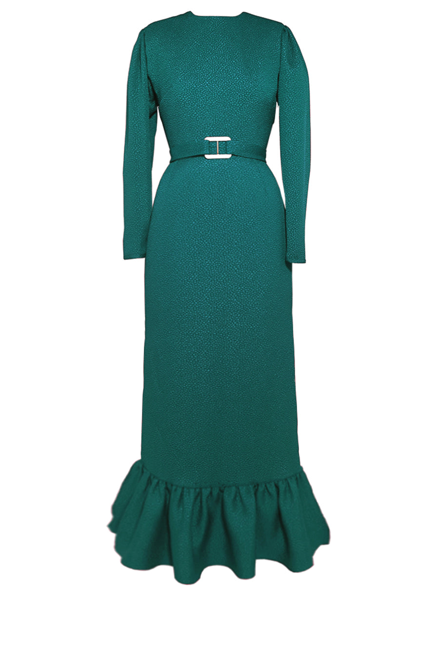 The Aphaea Dress has a fitted bodice and long sleeves with an elegant gathered details at the lightly padded shoulder. The crop-length skirt features slits at both sides and a decorative ruffle to ankle length, and a belt with our signature Ivory hand-covered buckle. Modern and elegant, this dress is perfect or a cocktail event or sophisticated evening out.