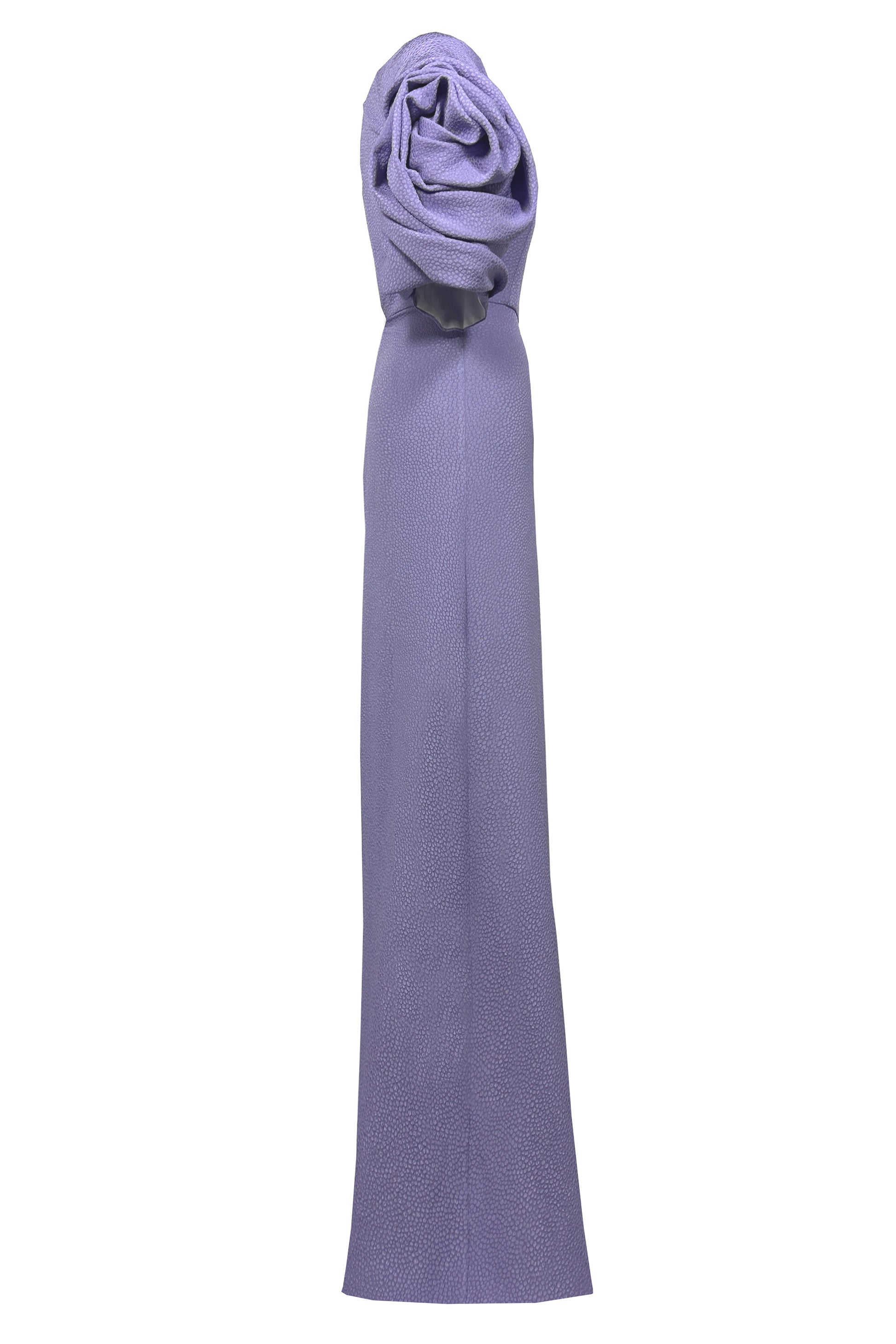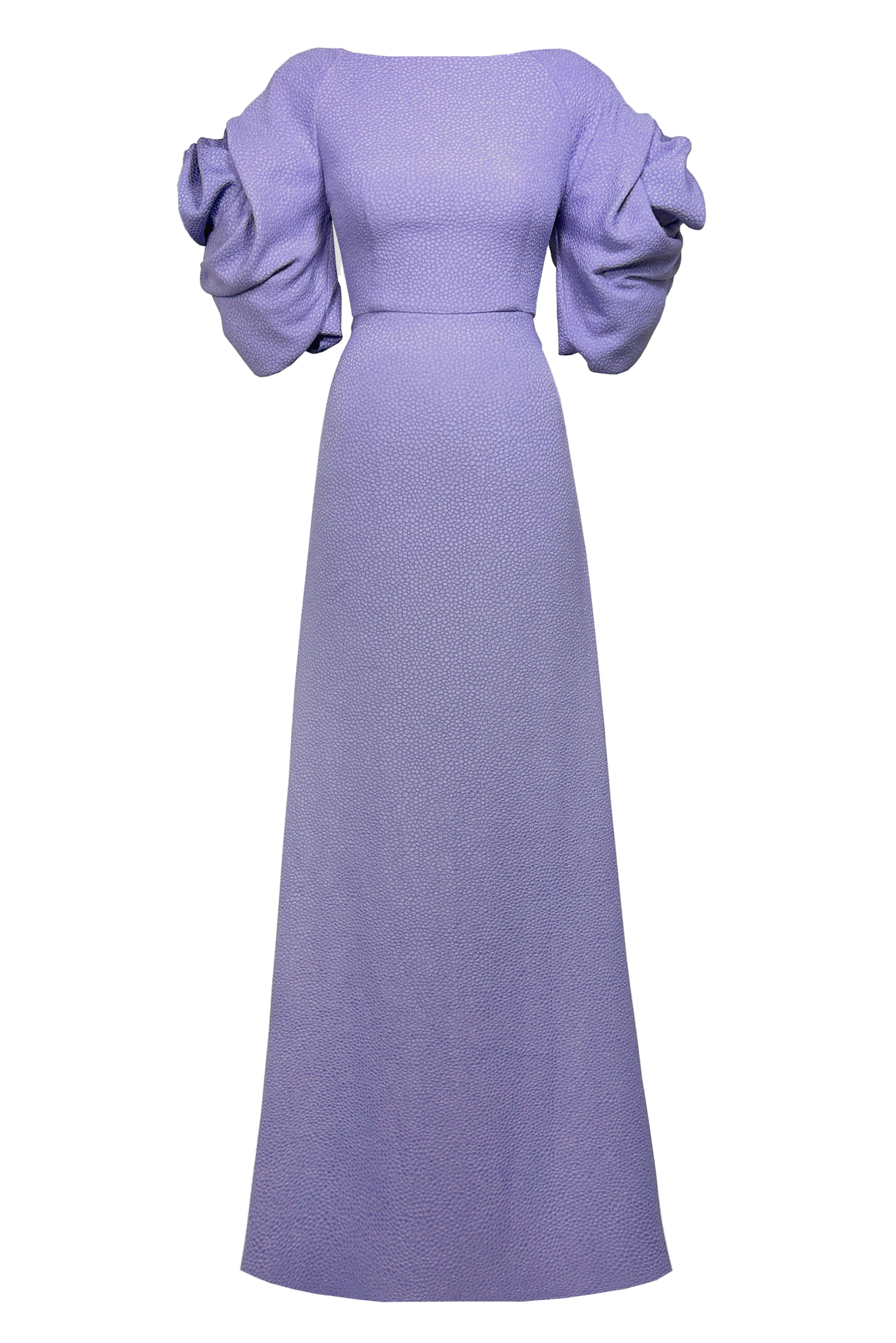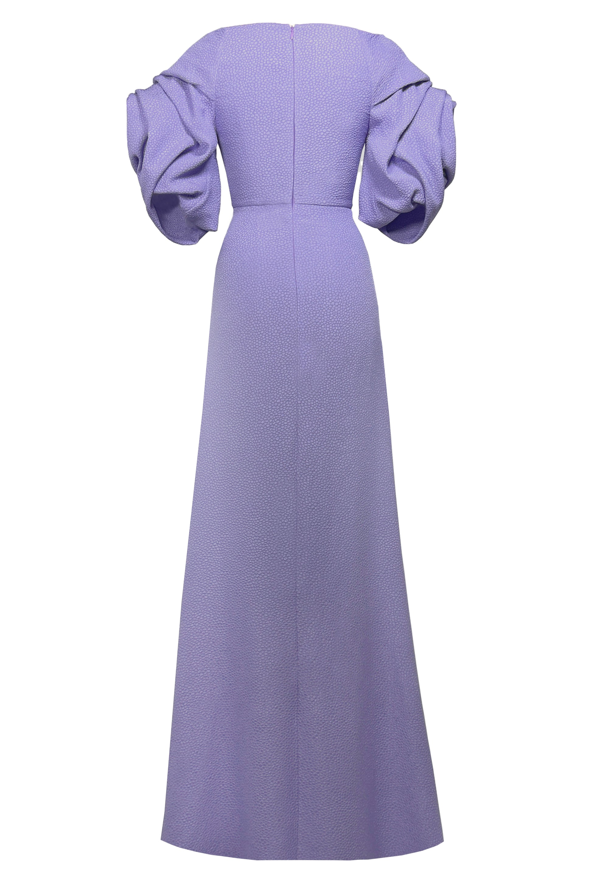 The Aphrodite Sleeve Gown has a boat neck bodice, fitted waist and a A line maxi skirt. The elbow length blouson sleeves feature a beautiful abstract, sculptural floral drape.