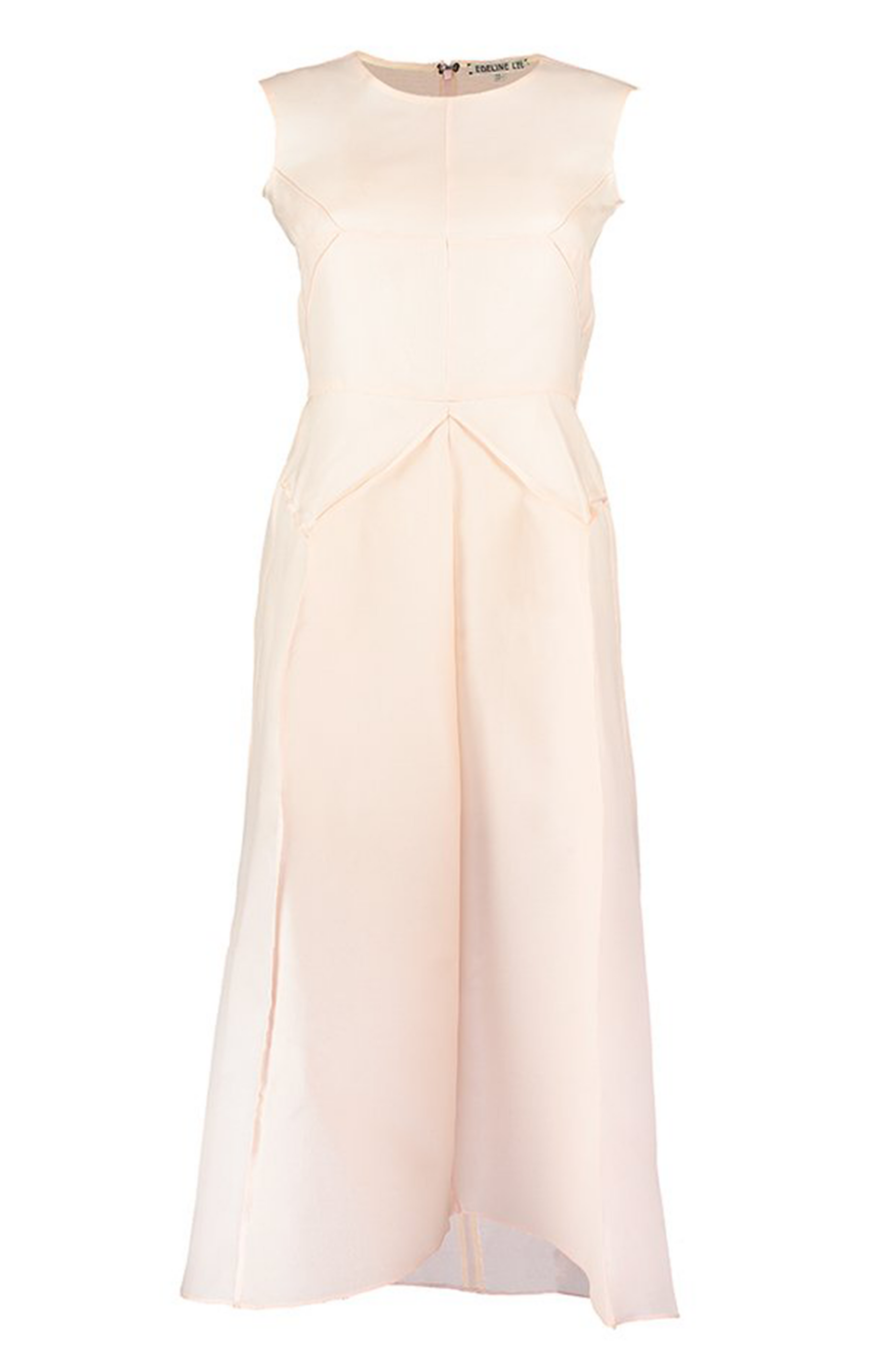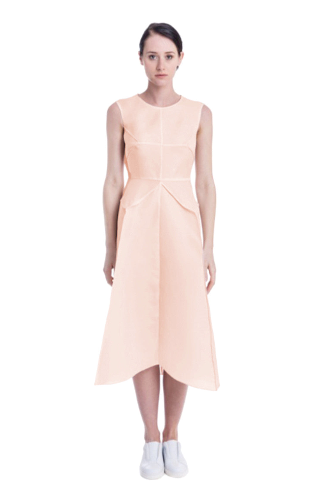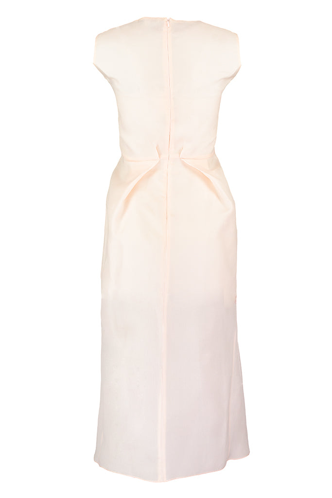 The panels feature varied seaming details and exposed French seams, emphasizing the architectural construction of the dress. Front skirt projects outwards while tucks at the back waist form a feminine shape. Midi length hem. This dress is semi sheer and is best worn with nude undergarments.