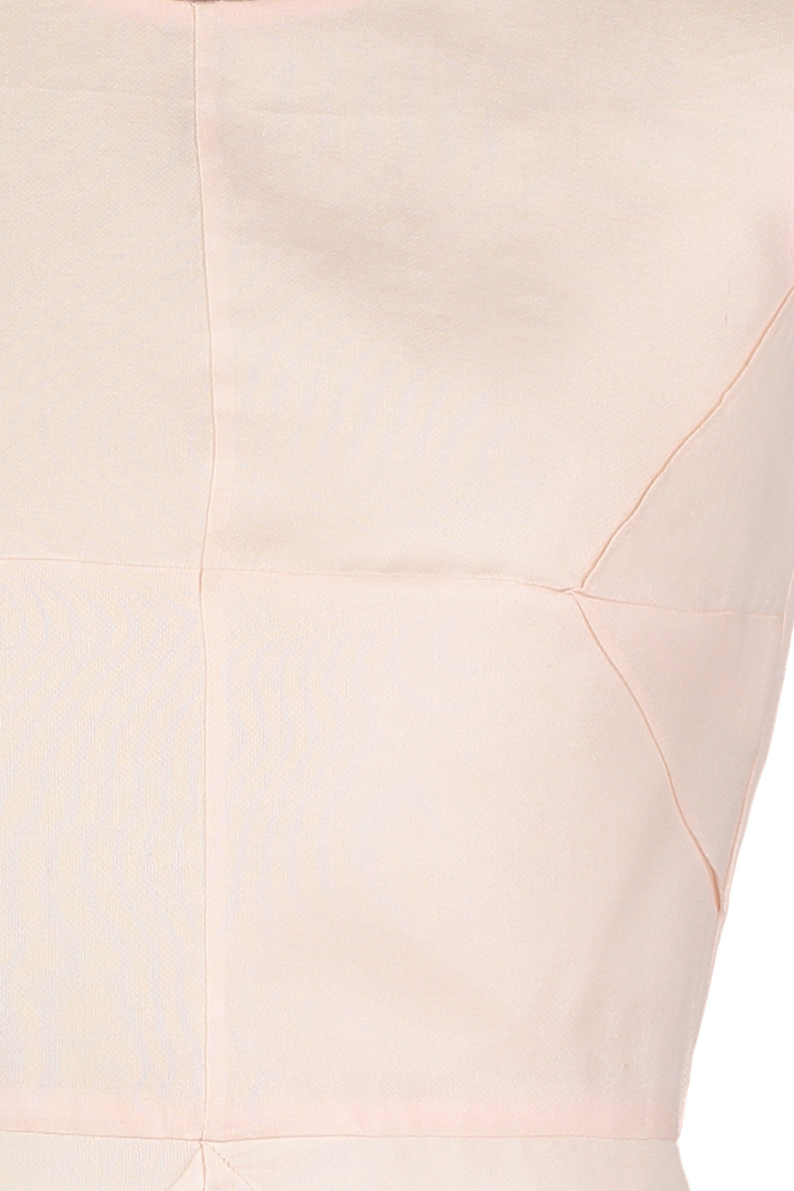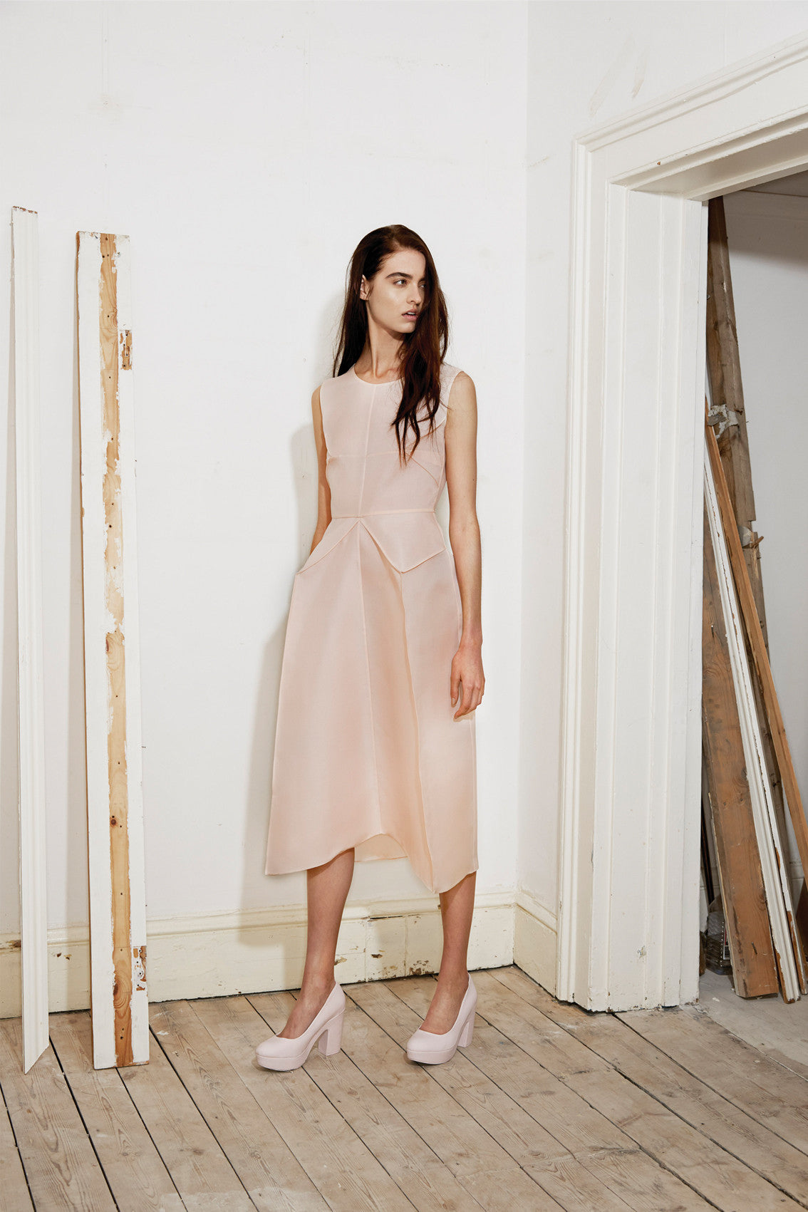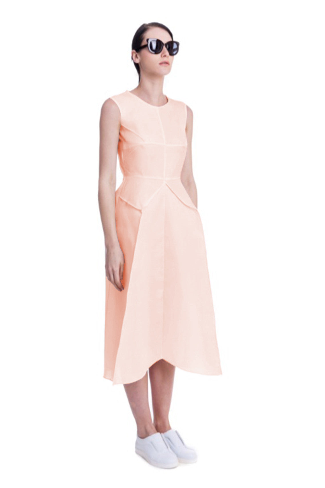 The panels feature varied seaming details and exposed French seams, emphasizing the architectural construction of the dress. Front skirt projects outwards while tucks at the back waist form a feminine shape. Midi length hem. This dress is semi sheer and is best worn with nude undergarments.
