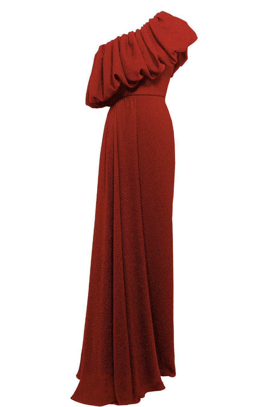The Aurora Gown has a full length skirt with an elegant, gathered drape and features a fitted bodice with a gathered ruffle that drapes over one shoulder. Dramatic and fun, this gown is flattering and perfect for a special occasion.