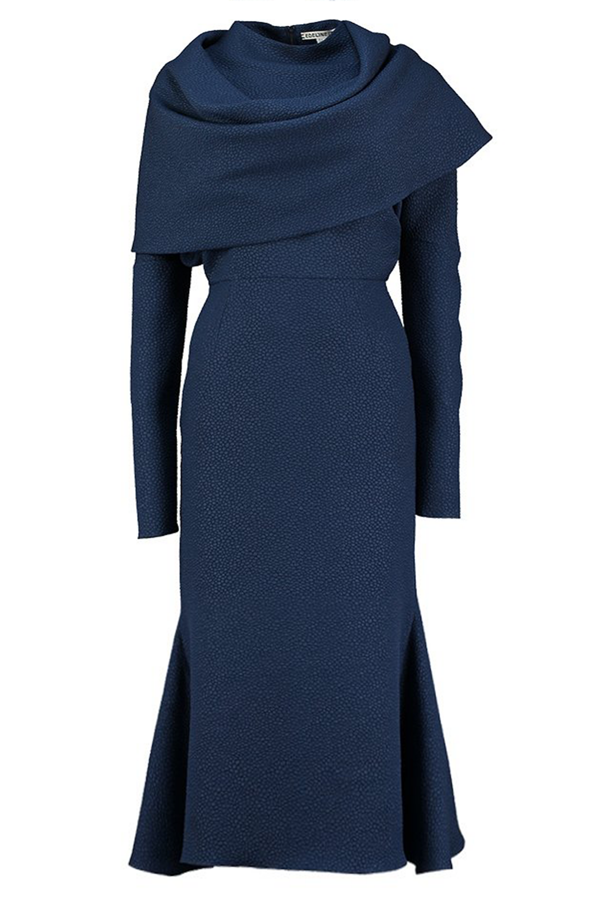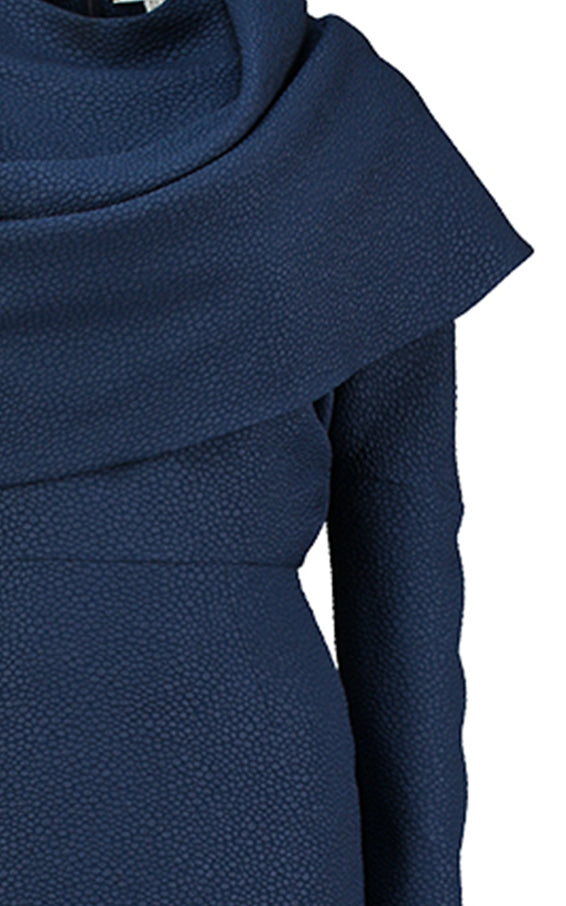 The Benedict Dress features a loose fitting bodice that fits snug at the waist, effortless cowl drape at the neck which can be worn gathered high up on the shoulder or can be alternatively worn draped over the arms. The skirt has a slim line that flares at the midi length hem.