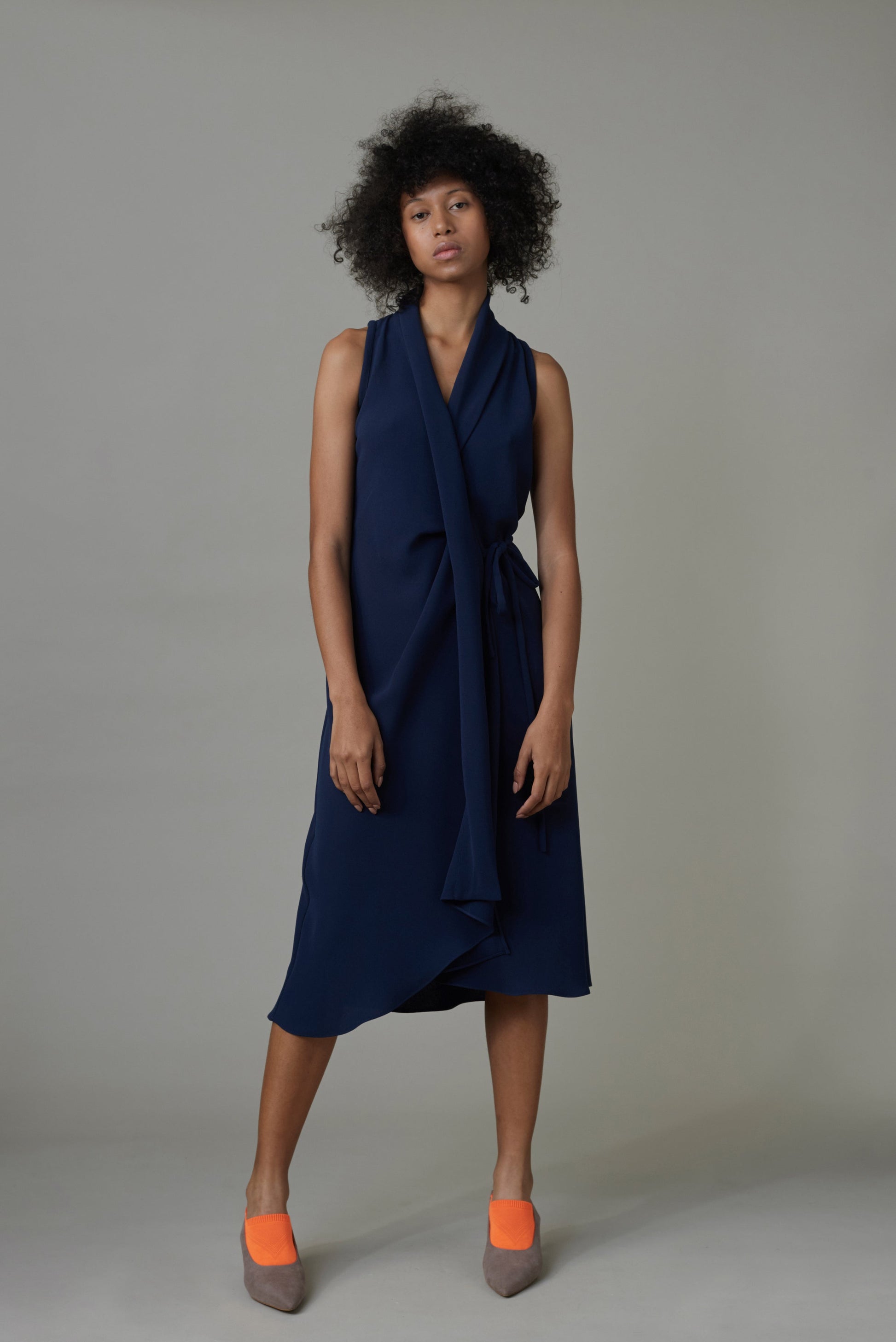 The Braid Dress is an elegant wrap dress which can be fastened to be fitted either tightly or loosely at the waist. The dress features asymmetrical pleated details, is sleeveless with a slight halter open neckline and finishes just below the knee.