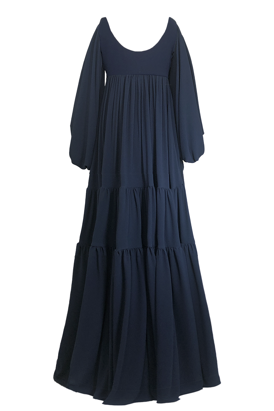 The Cosmos Gown is hand-crafted in England from a light-weight Crinkle Georgette and a mid-weight smooth textured Georgette Champion woven in Italy.