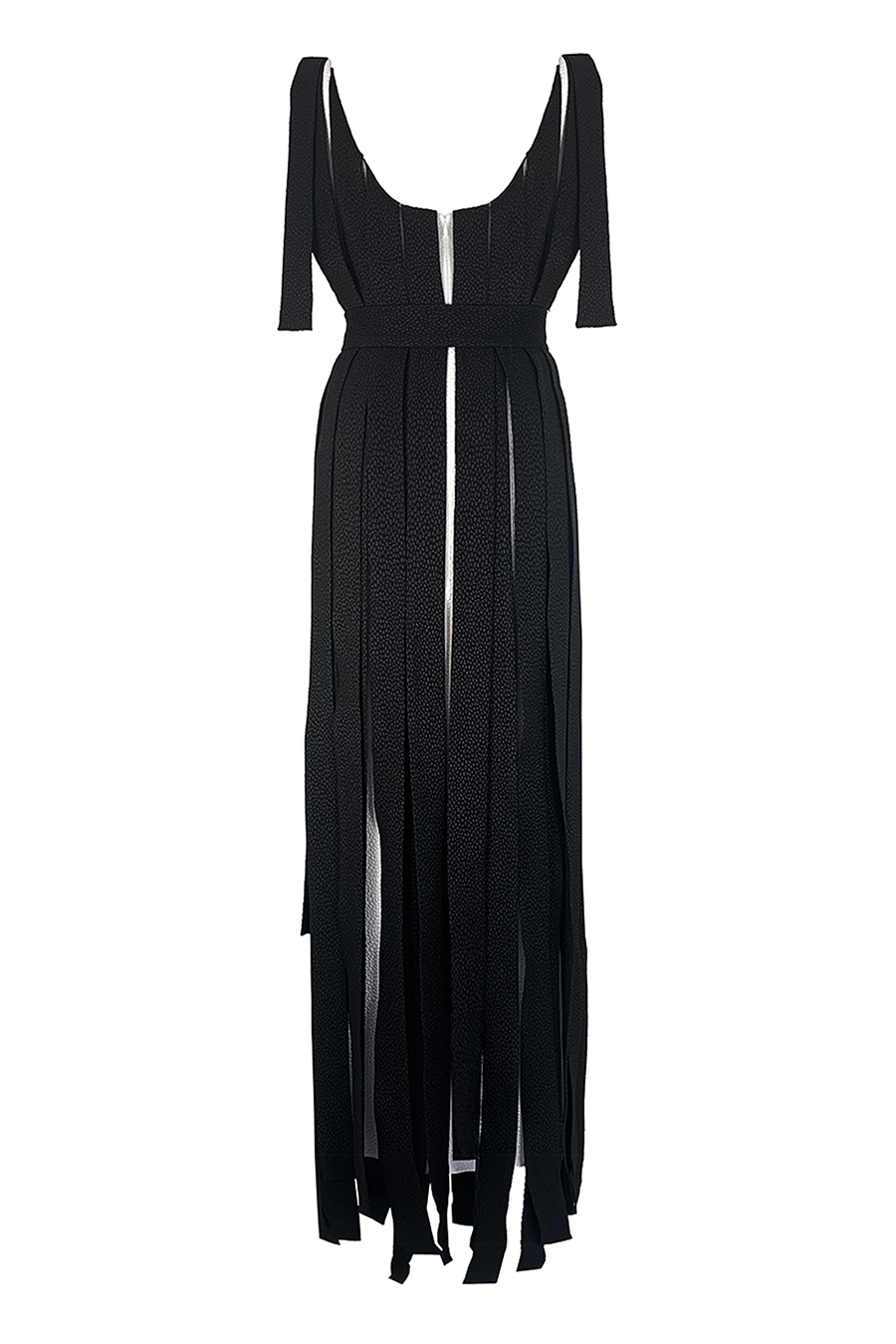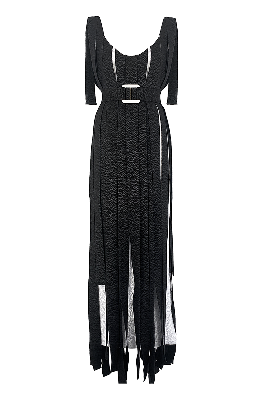 The fabric, which falls at varying lengths, has been cut into three-dimensional panelled ribbons and reveals slithers of the contrasting coloured fabric underneath as it swishes around your legs. A deep, scoop neck at front and back, and a self-belt with our signature hand-covered Italian buckle with Gold hardware completes this showstopper. This dress comes in a playful color block of Black and Ivory.