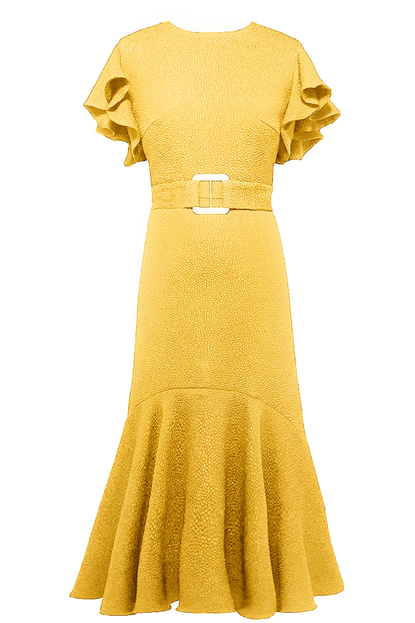 The Dada Dress features a fitted bodice with a three-dimensionally curving deep ruffle hem and feminine flutter sleeves. The generous weight of the midi length hem swishes around your legs as you walk. Paired with a removable fabric belt featuring our signature Ivory fabric covered buckle, this dress will make you look feminine and beautiful for any occasion.
