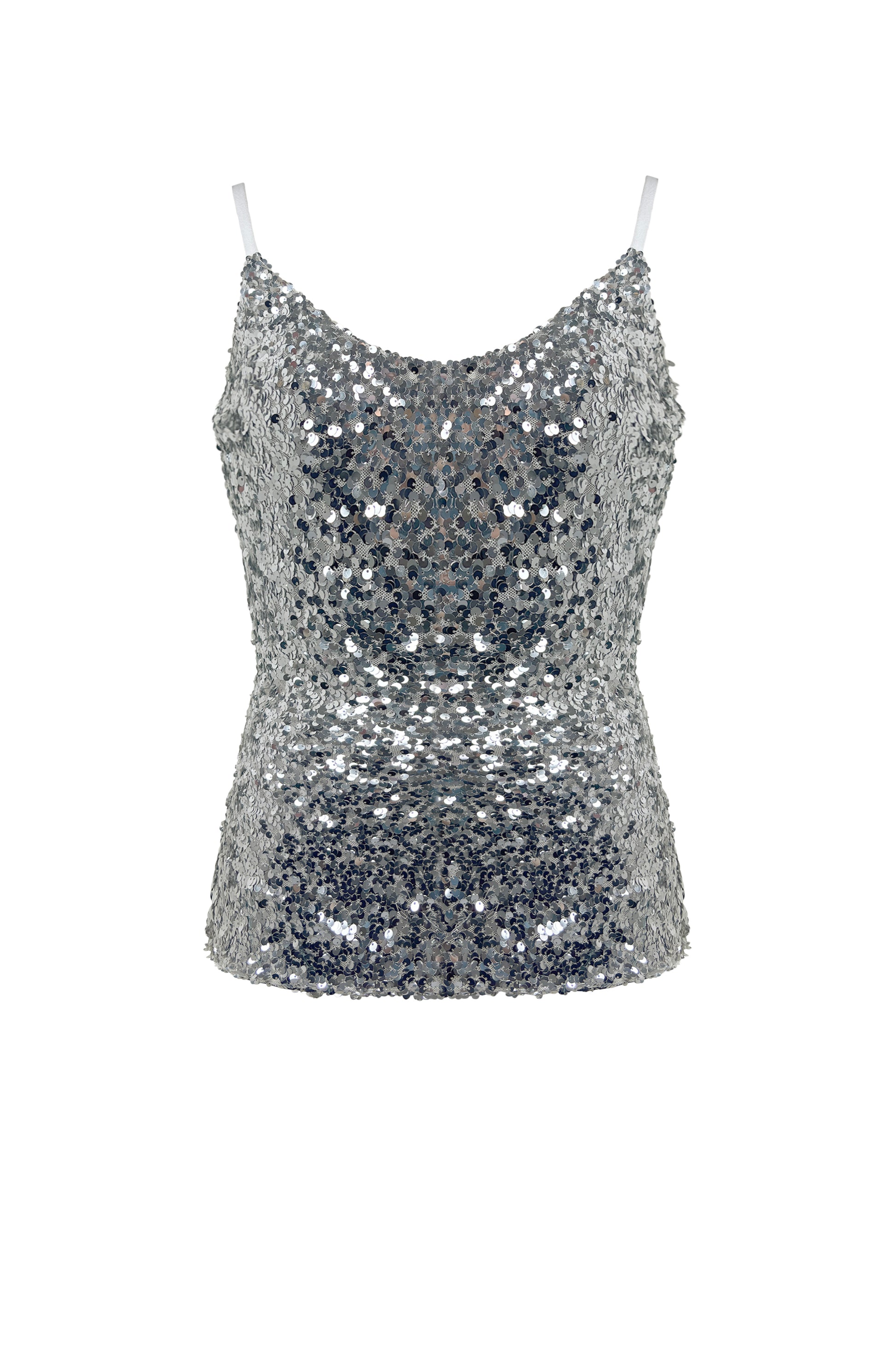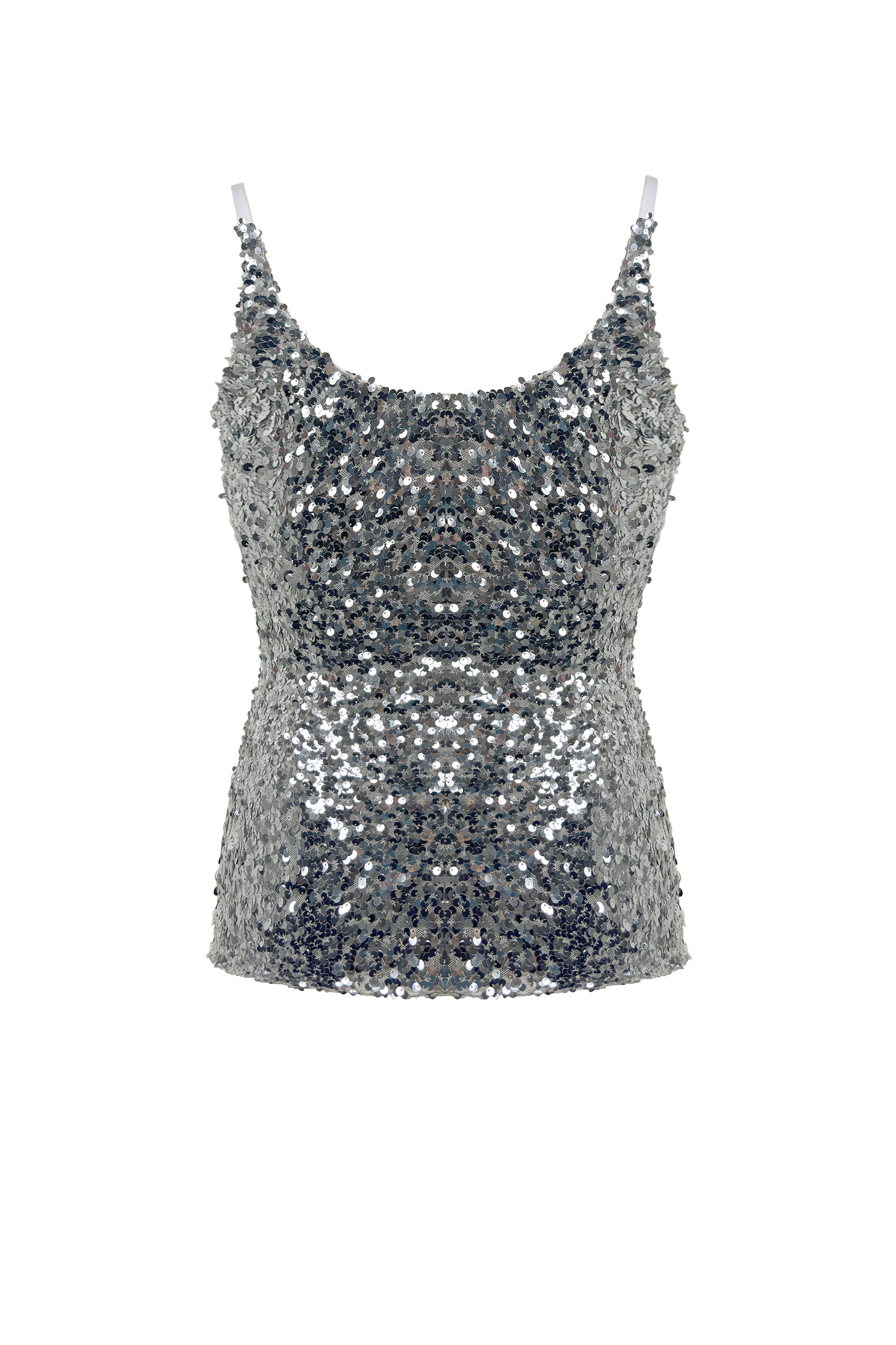 The Danae Slip Top is hand-crafted in England from a compact Scatter Allover Sequin Net, woven in Italy and is fully lined.