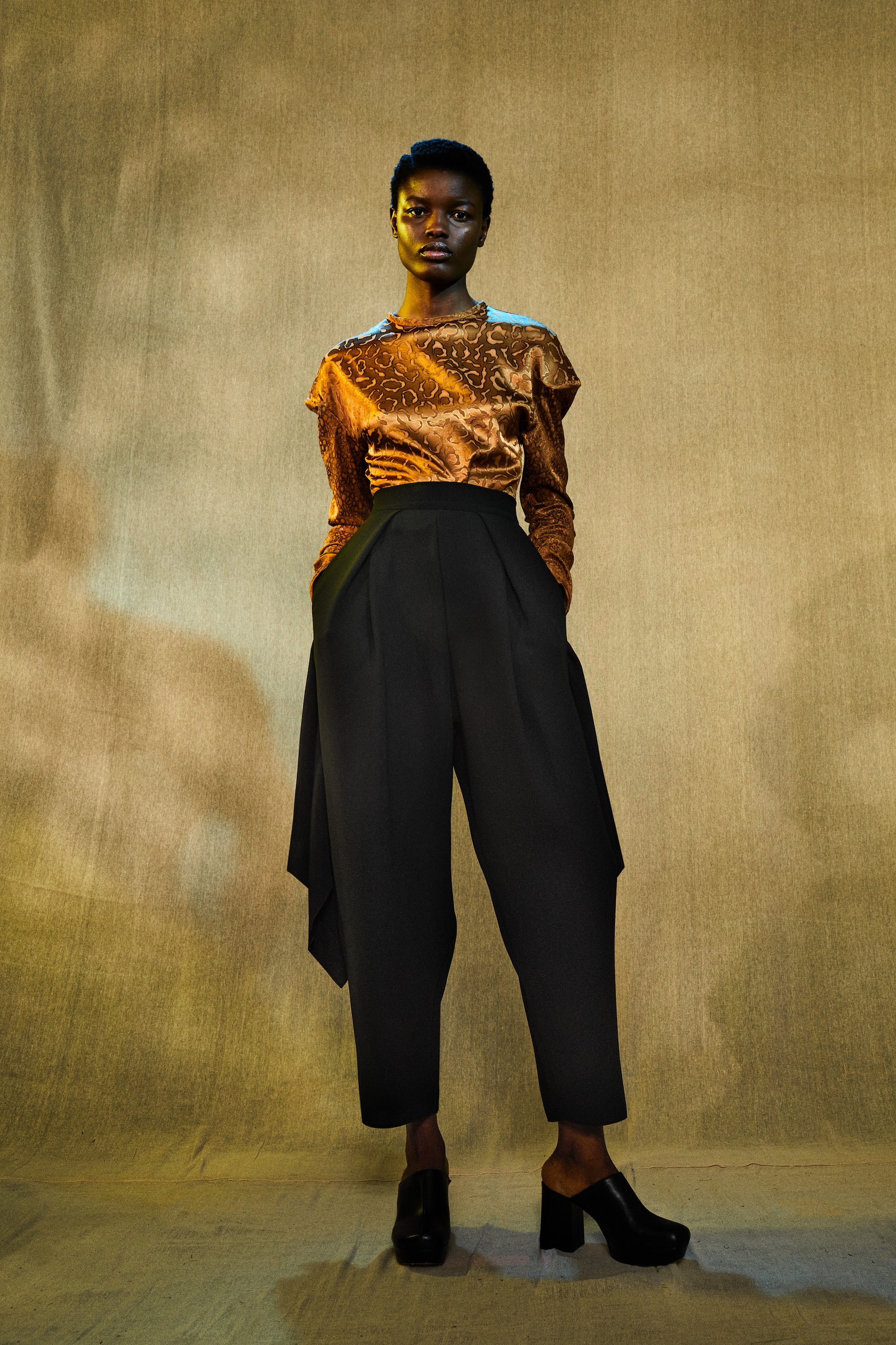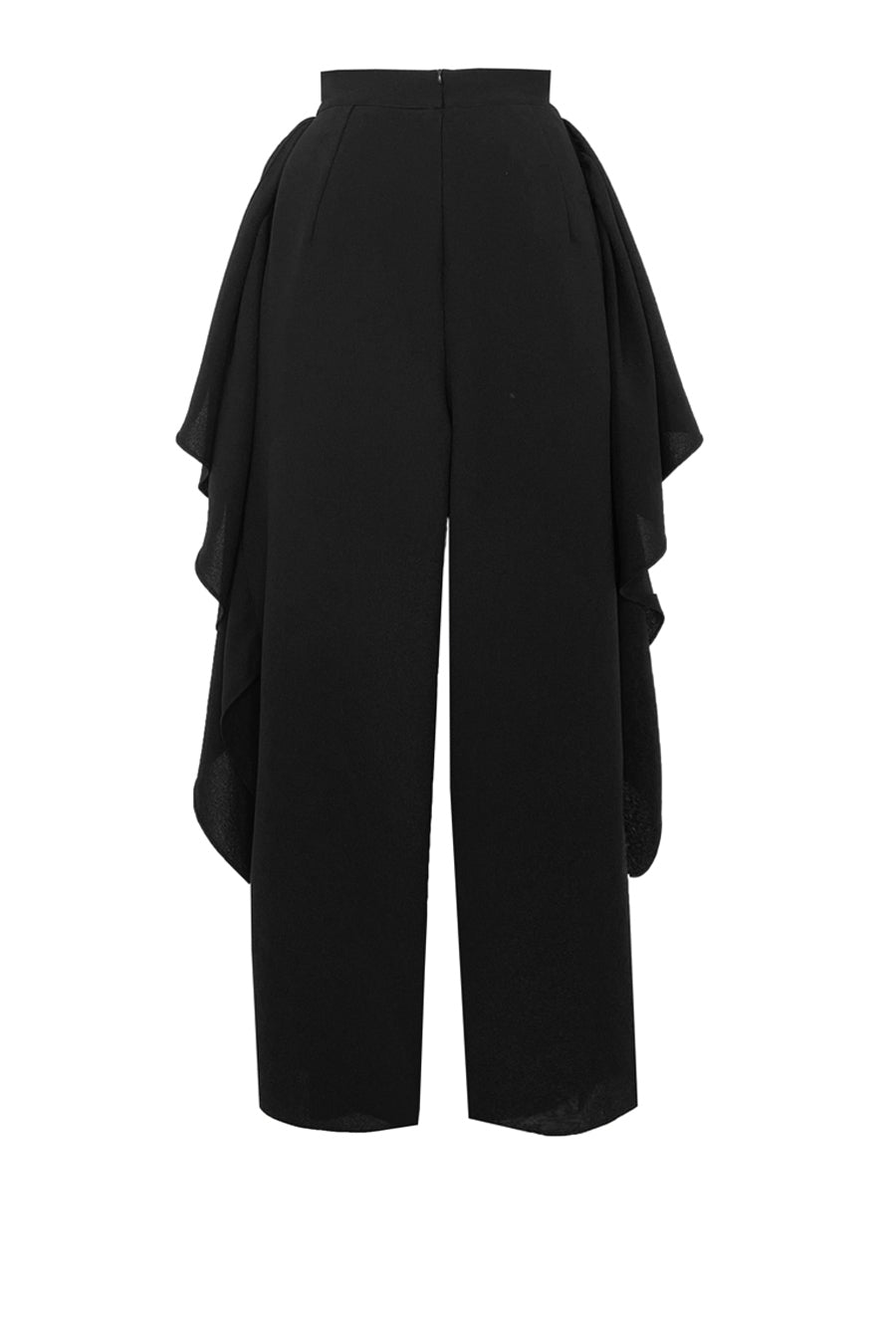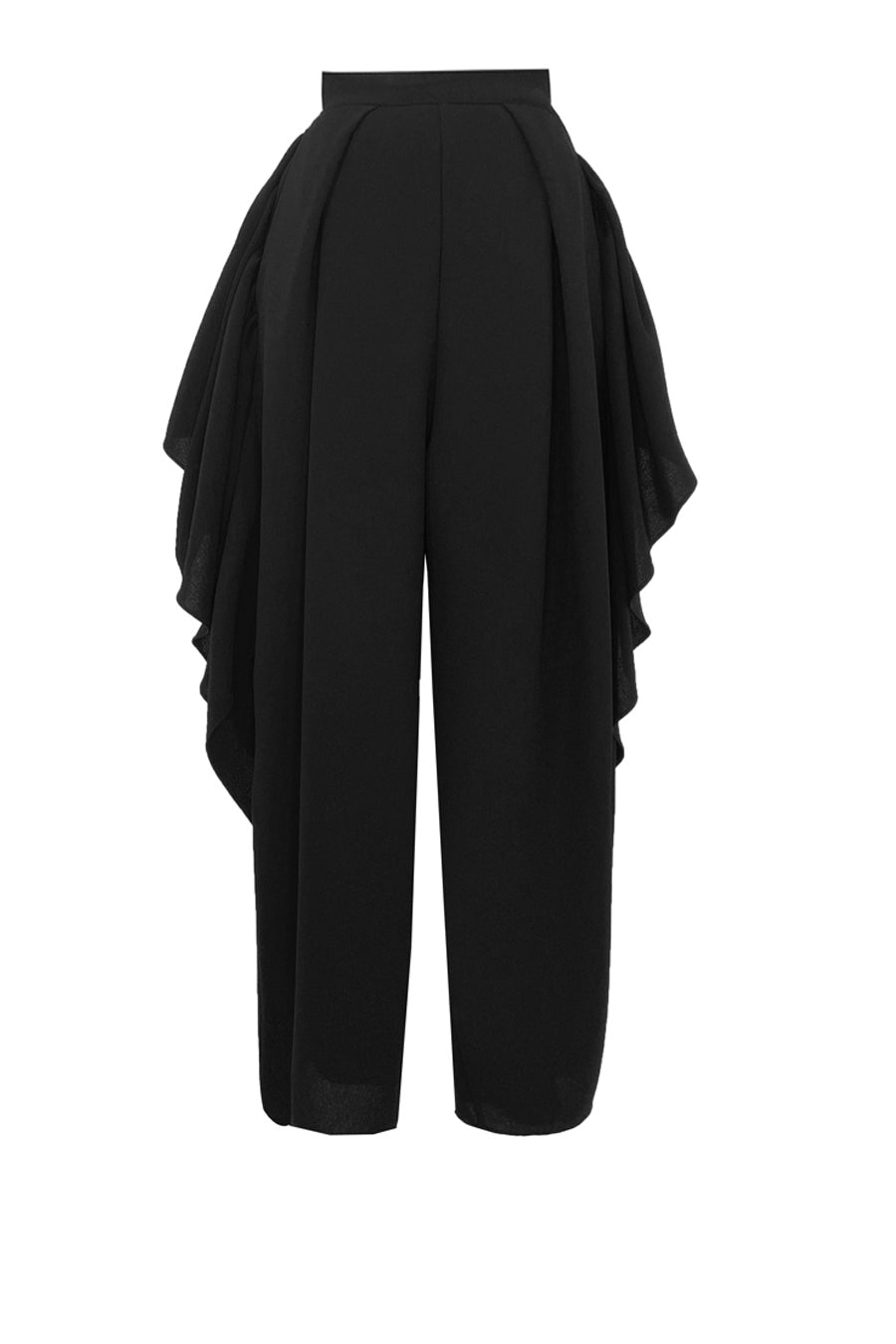 The Delphine Trouser is a high waisted, elegantly cut pair of trousers with a loose fit and a draped ruffle along the side seam. These trousers feature deep pleats at the front waistline and pockets at the hip.
