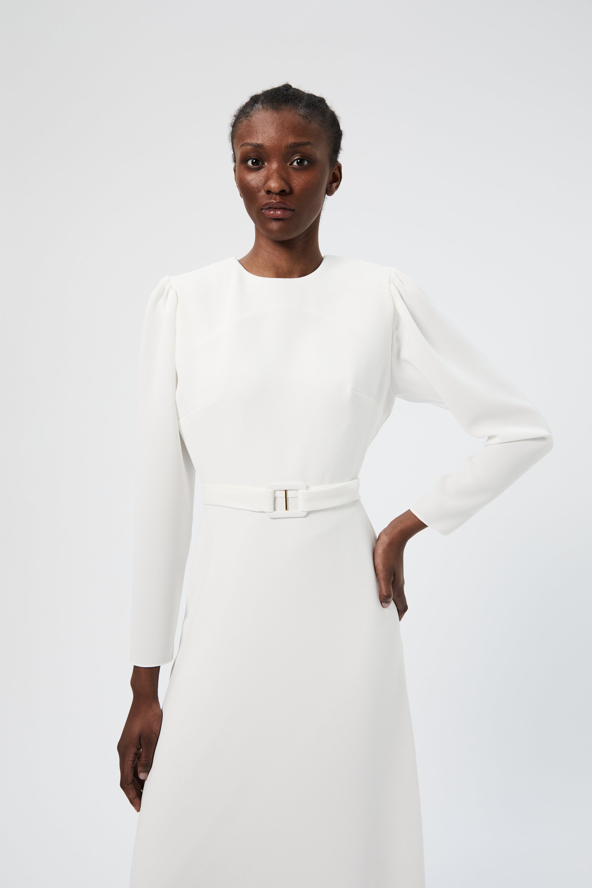 The Diana dress is classic and elegant, with an A-Line, midi-length dress with a sculpted, fitted bodice and long sleeves with an elegant gathered details at the lightly padded shoulder. Also features a belt with our signature Italian hand-covered Ivory buckle with gold hardware.