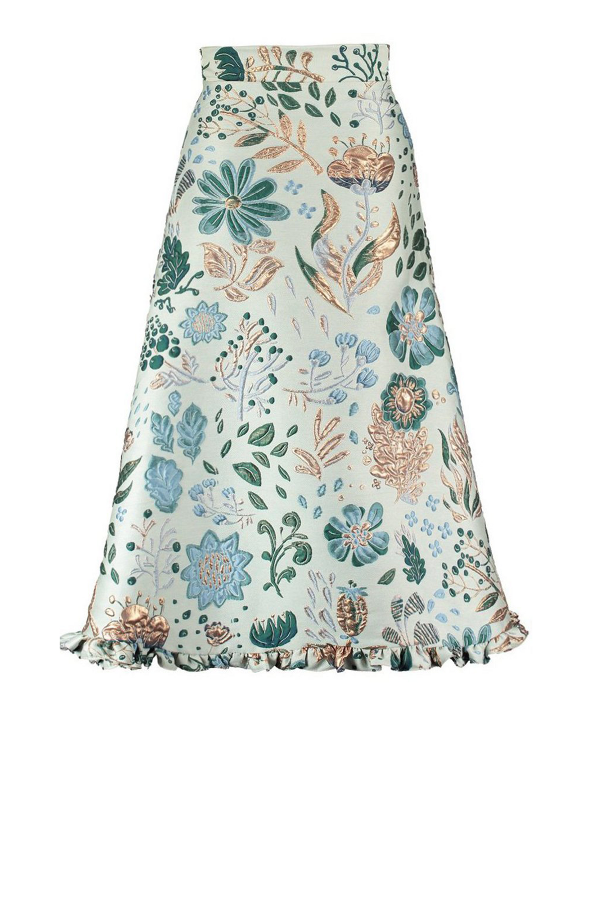 Style with the Penelope Sleeveless Shirt to complete the look or with just a simple white t-shirt for more laid back casual vibe. The Dione Skirt is hand-crafted in England from a rich silk blend three dimensional Floral Jacquard woven in Italy.