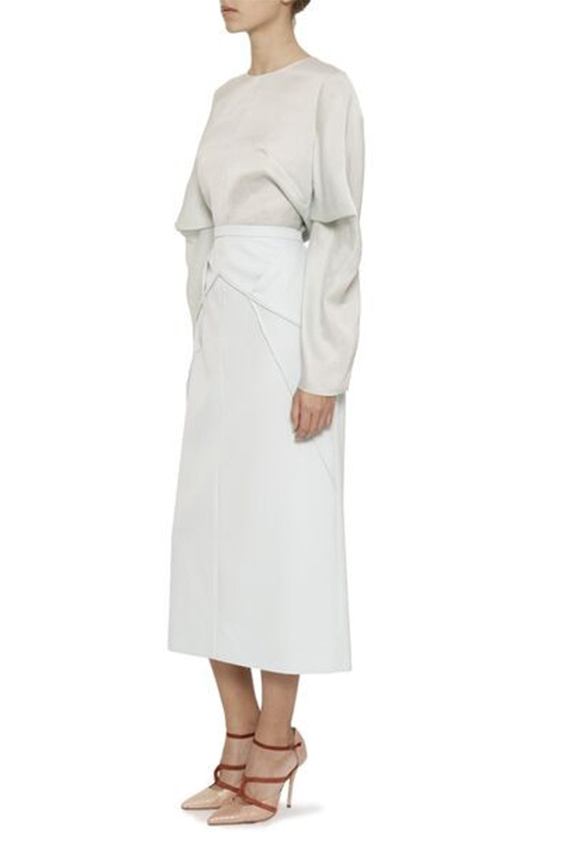 Pair with the Cornice Blouse for a chic work appropriate yet fun outfit. The Entablature Skirt is crafted in England from Stretch Gabardine woven in Austria.