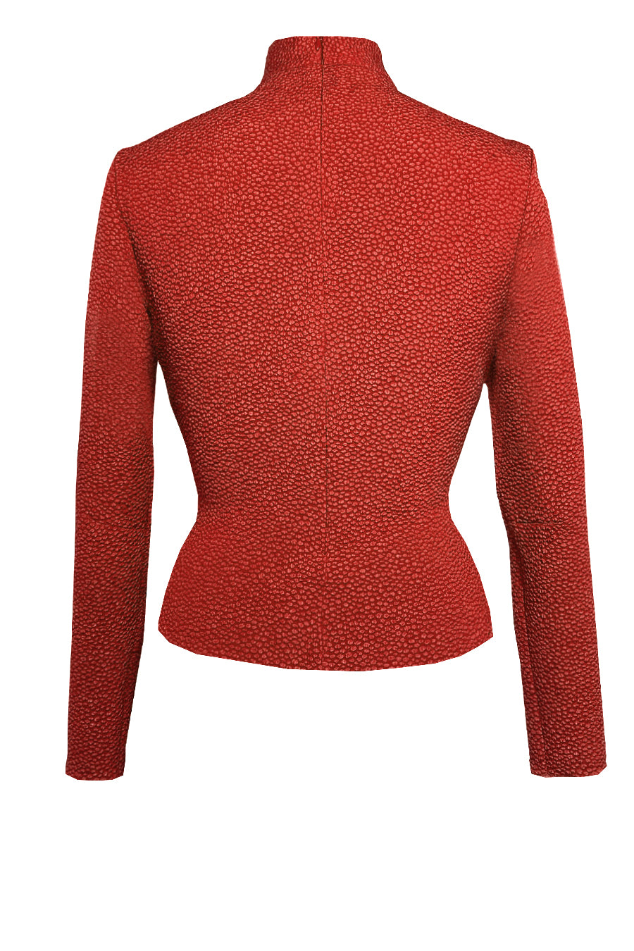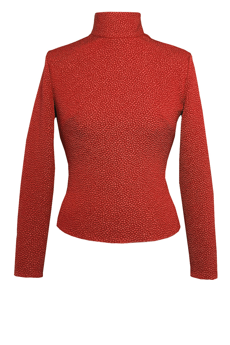 The Eos Top has a fitted bodice with a high neck and long, close fitting sleeves.