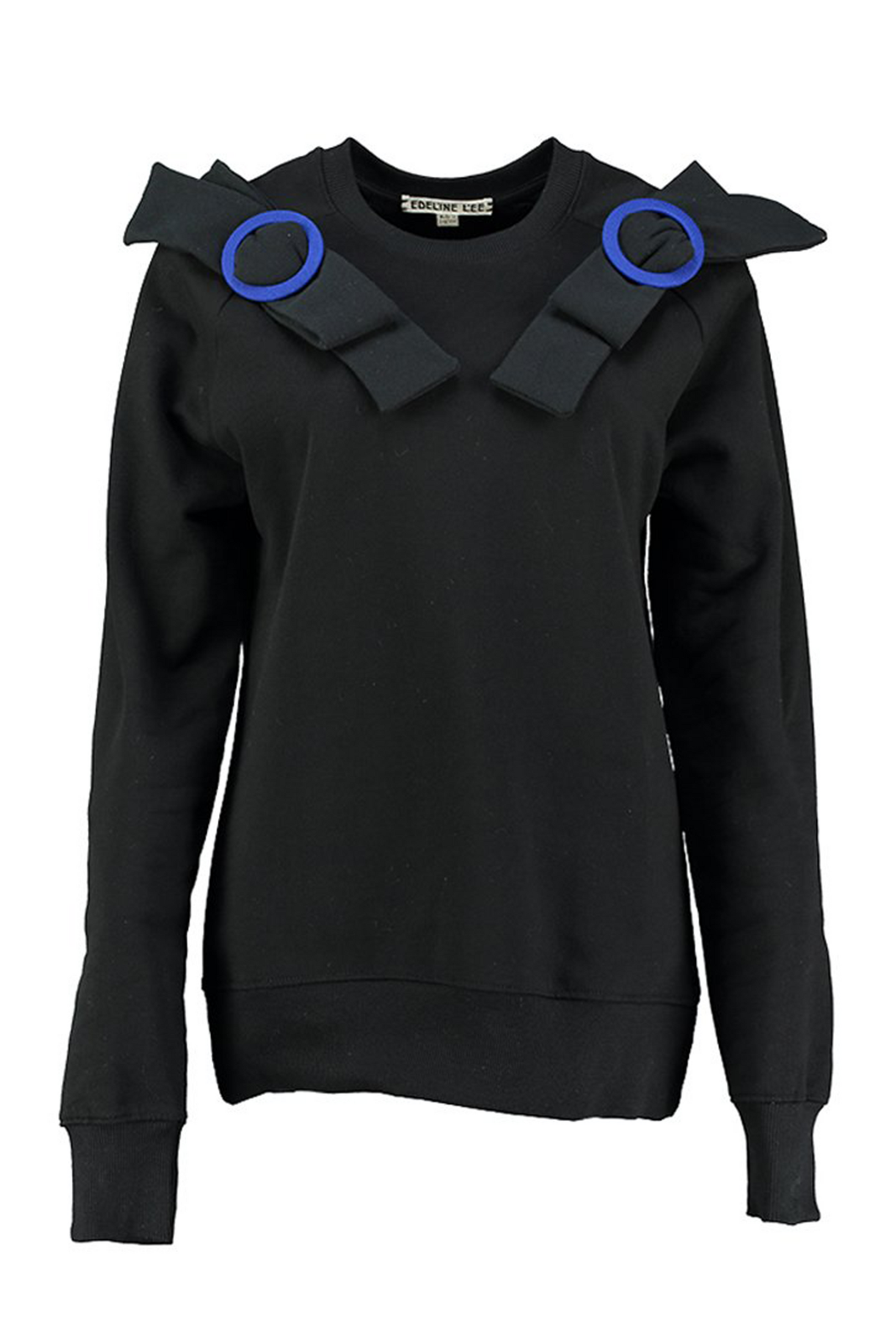 The Elbow Sweatshirt is a easy top with two chic bows with Cobalt Blue buckles appliqued on the shoulders. Details include a round ribbed neck and hem, long cuffed sleeves, and Italian fabric-covered buckles.