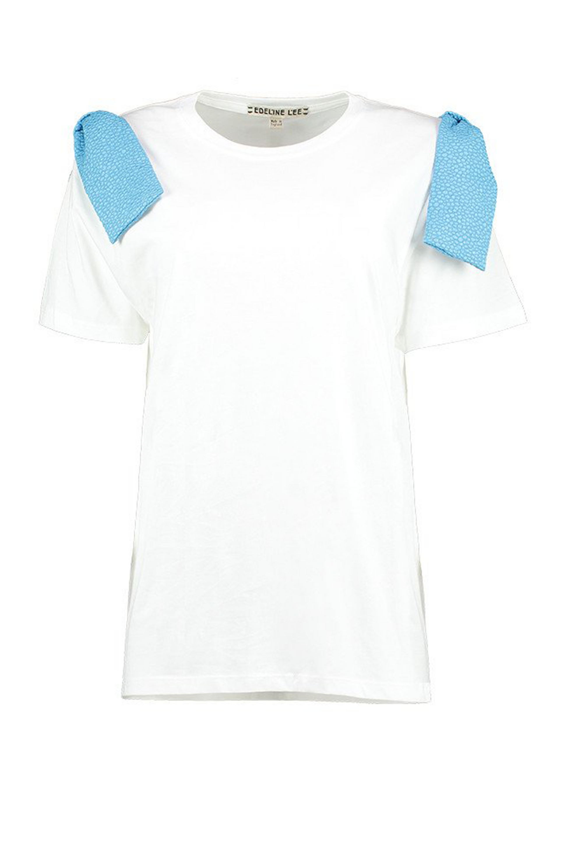 The Epaulette Bow T-shirt has two sweet, oversized bows on the shoulders. The bows are made of contrast color Italian Flou Bubble Jacquard. Details include a round neck and short sleeves.