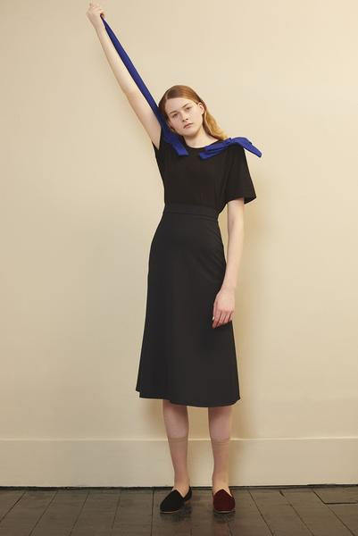The Epaulette Bow T-shirt has two sweet, oversized bows on the shoulders. The bows are made of contrast color Italian Flou Bubble Jacquard. Details include a round neck and short sleeves.