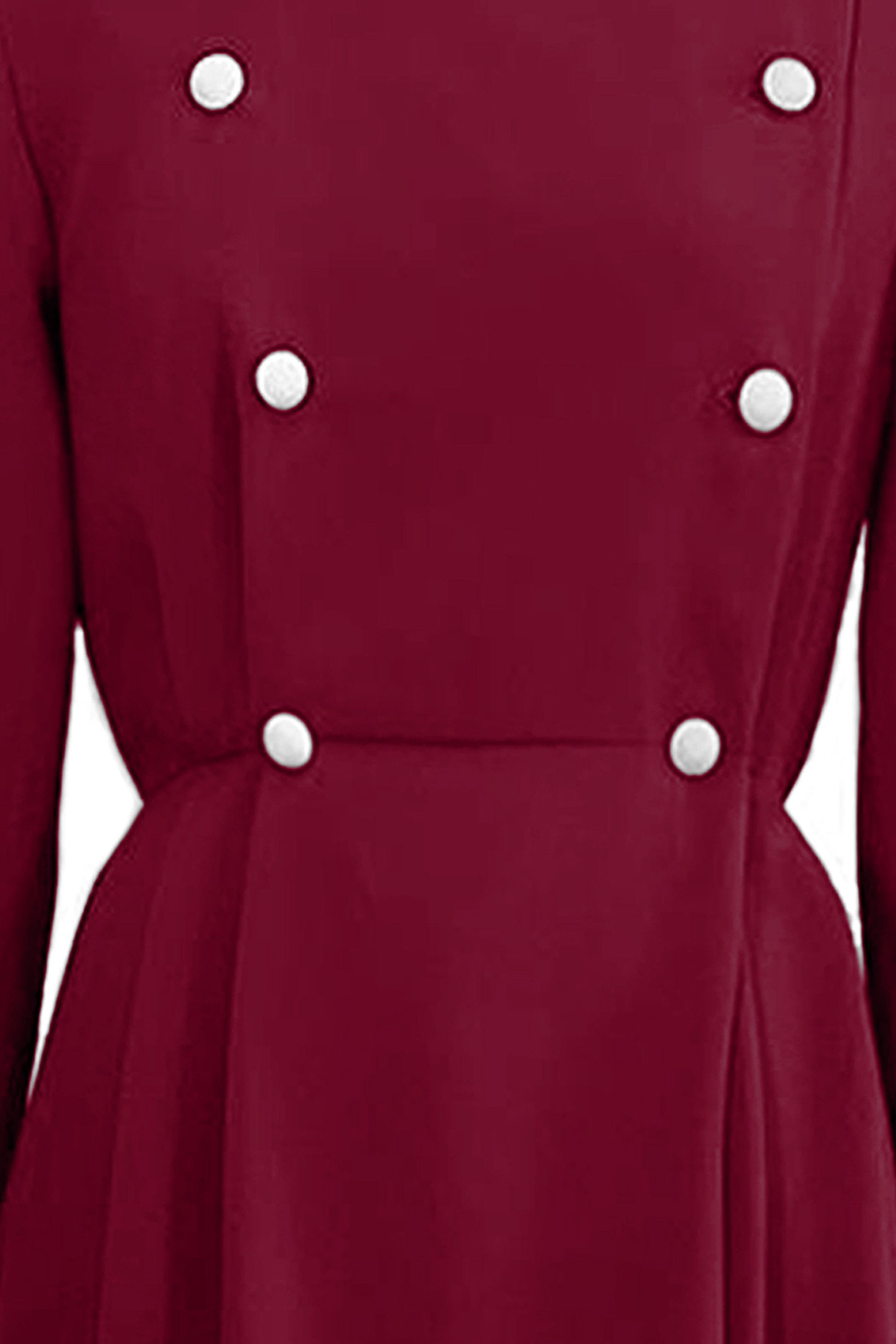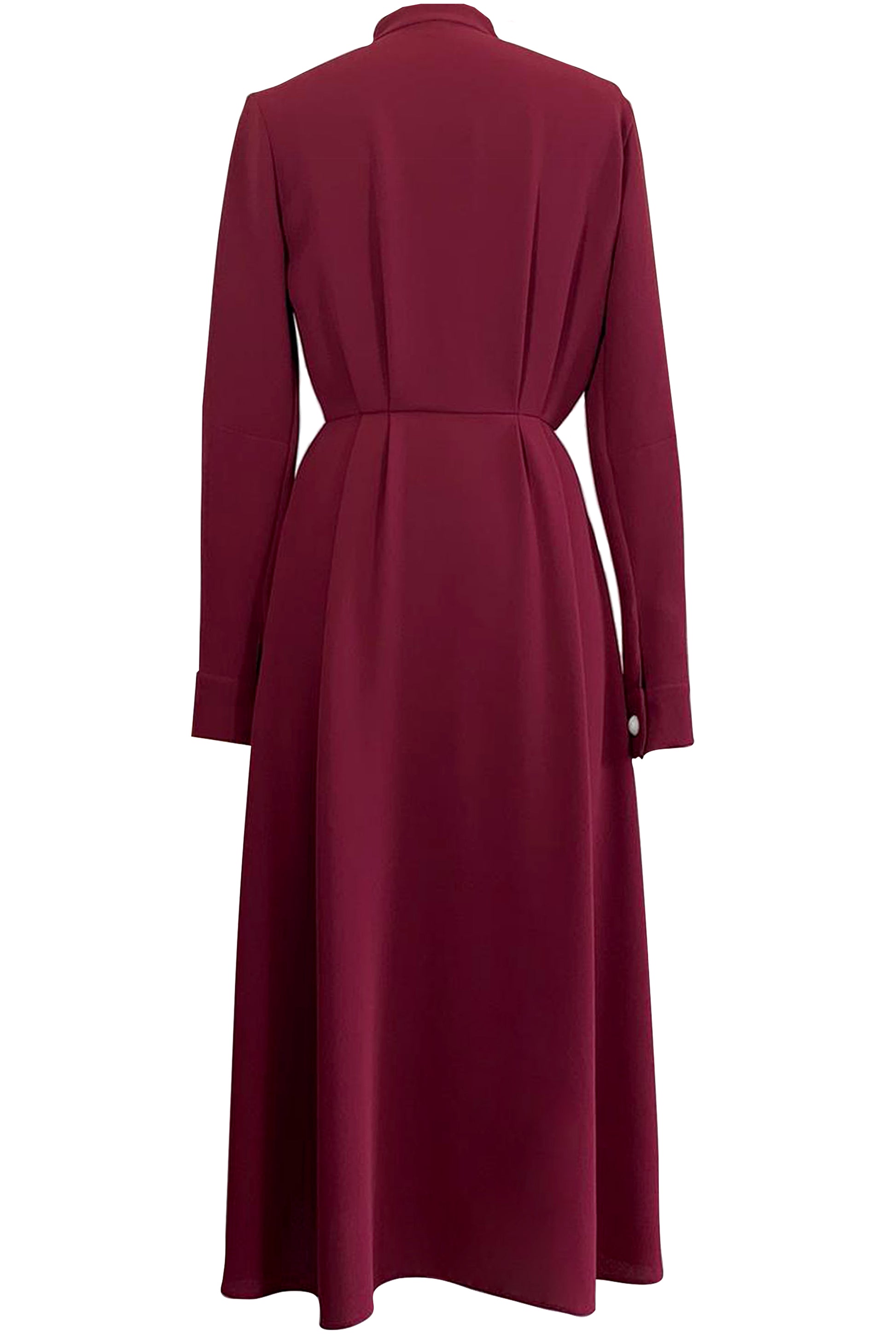 The Eurydice Dress features a small stand collar, double breasted bodice, long cuffed sleeves, a pleated A line midi skirt, and contrast hand-covered buttons.