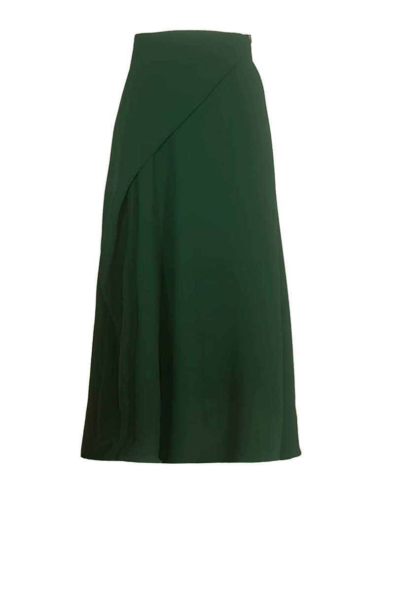 The Fatale Midi Skirt features an asymmetrical deep pleat at the front waistline flowing down into a gently flared skirt.