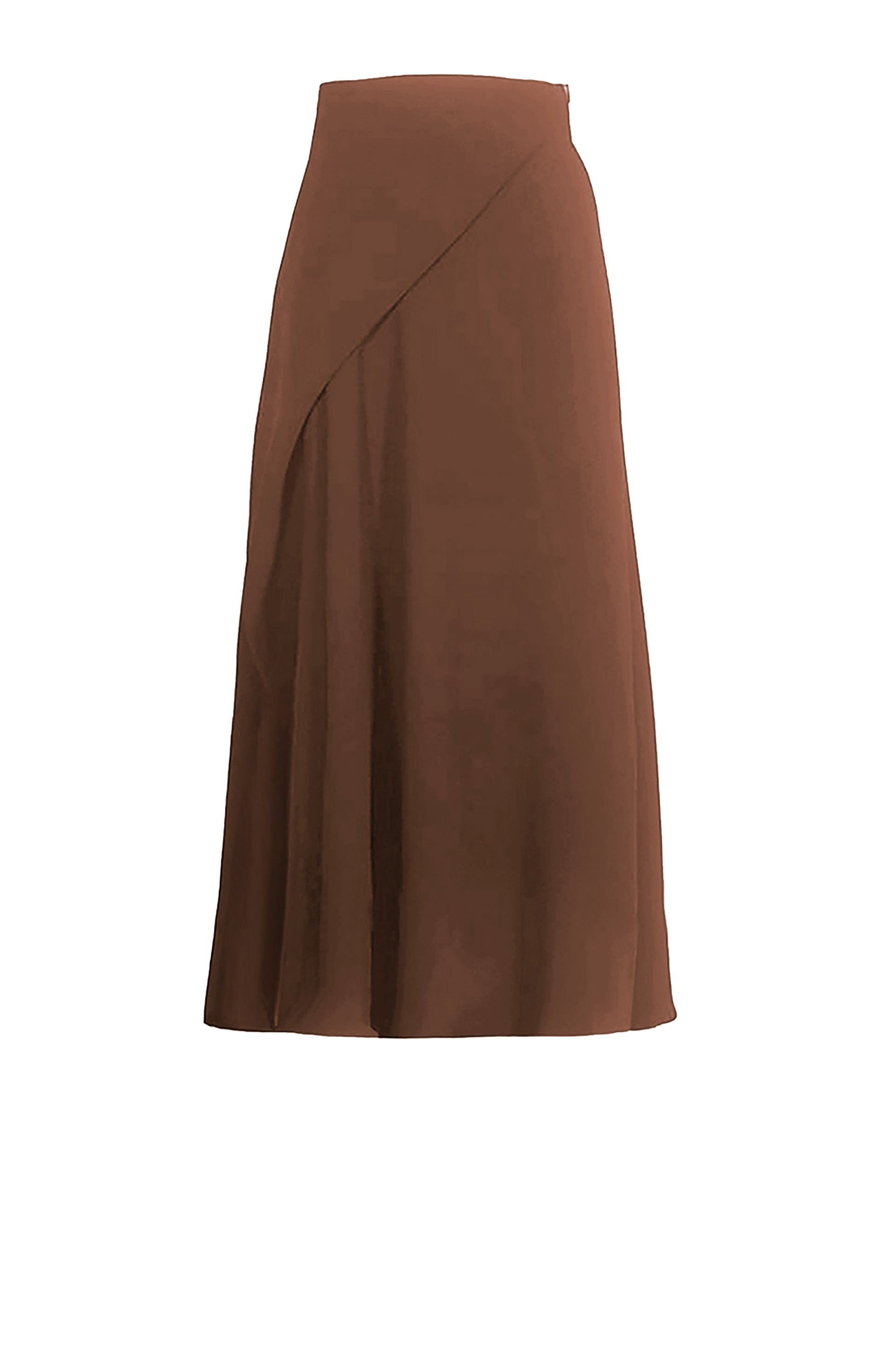 The Fatale Midi Skirt features an asymmetrical deep pleat at the front waistline flowing down into a gently flared skirt.