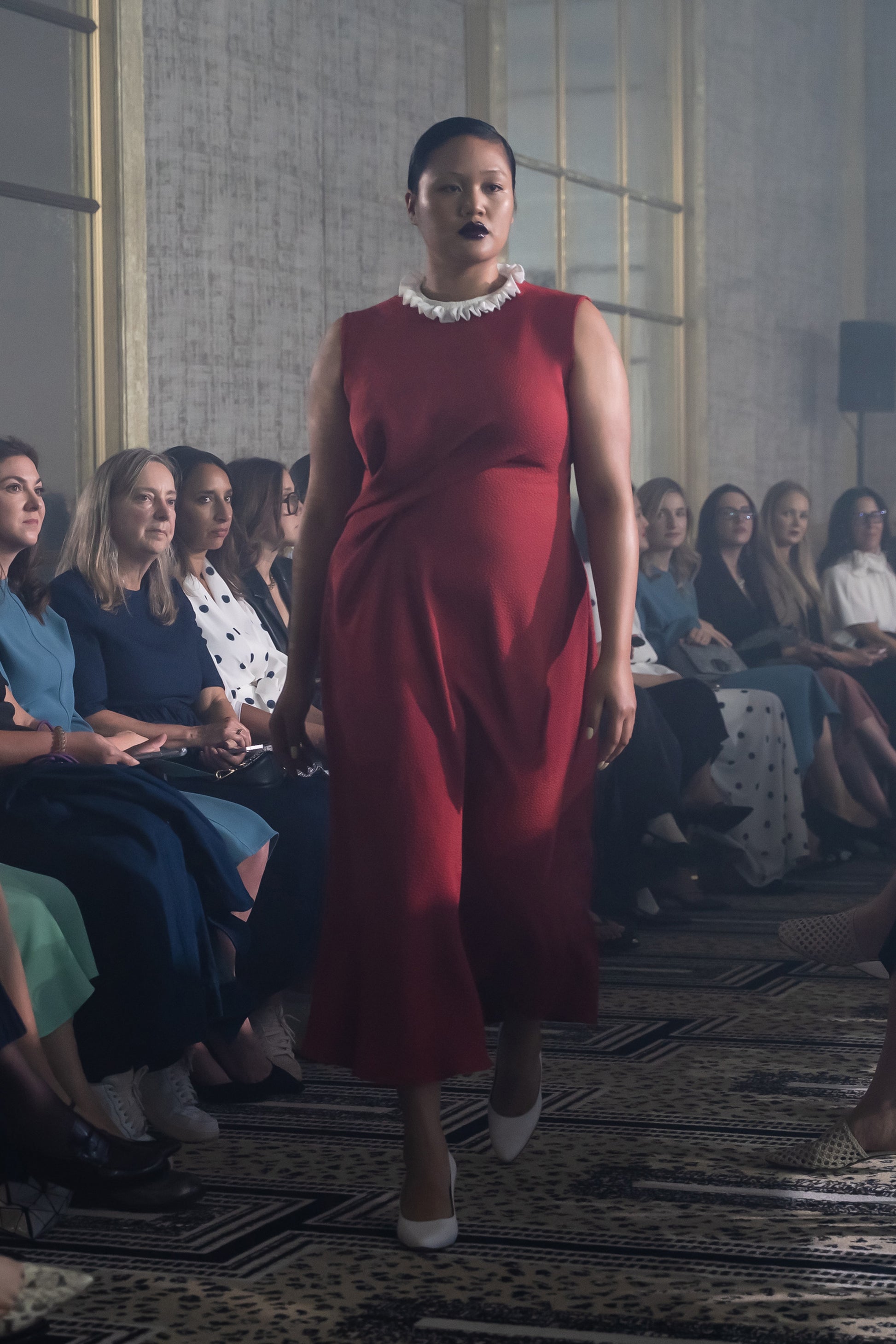 The Finial Dress features a round neckline, fitted bodice and an effortless drape across the bodice and at the hip that flares asymmetrically into the skirt.