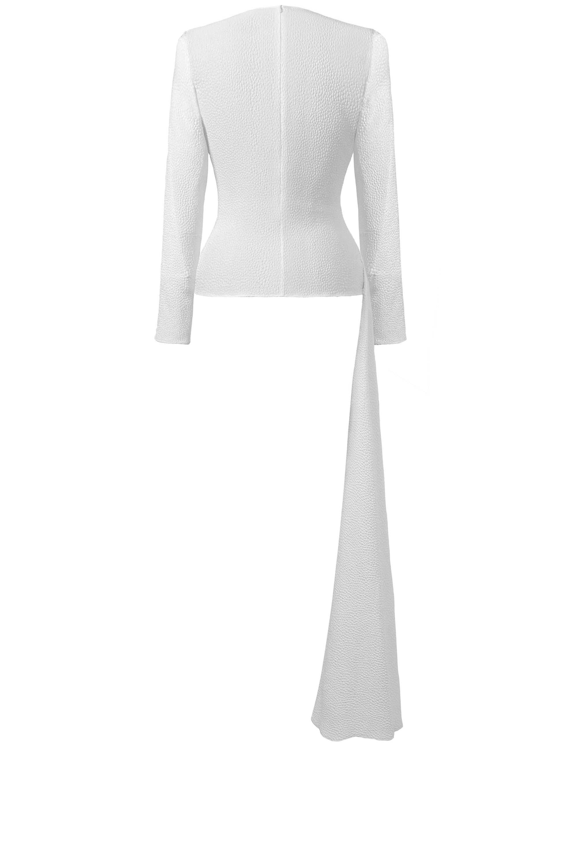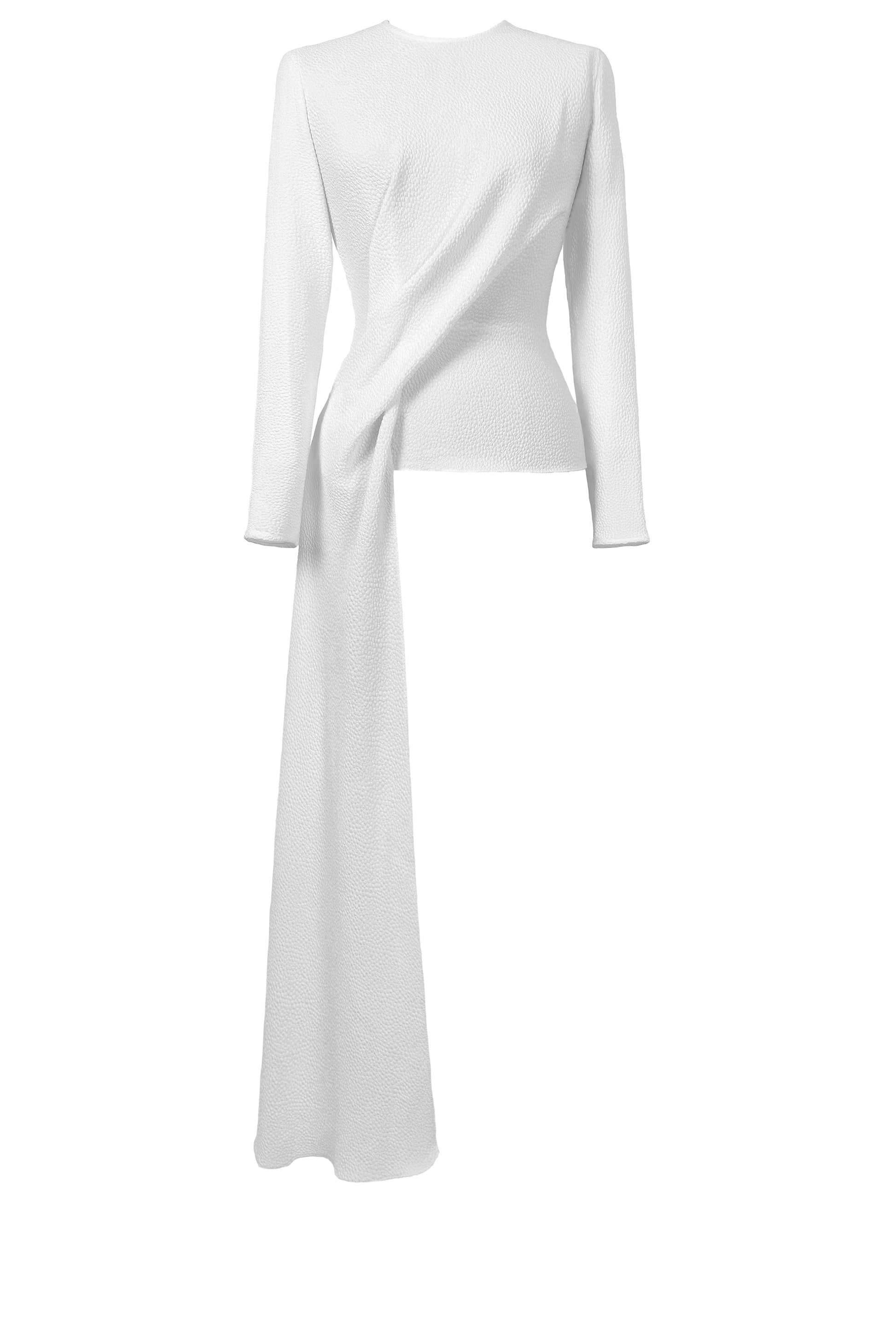 The Fleche Top features a rounded neckline, an asymmetrical drape detail, a fitted bodice and long fitted sleeves. The effortless drape across the bust and the waist and flows down below the hip on one side. The sash falls down to hip length creating a dramatic but easily wearable detail.
