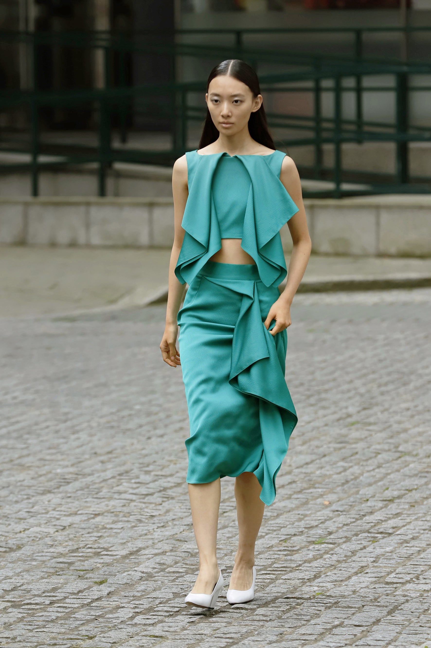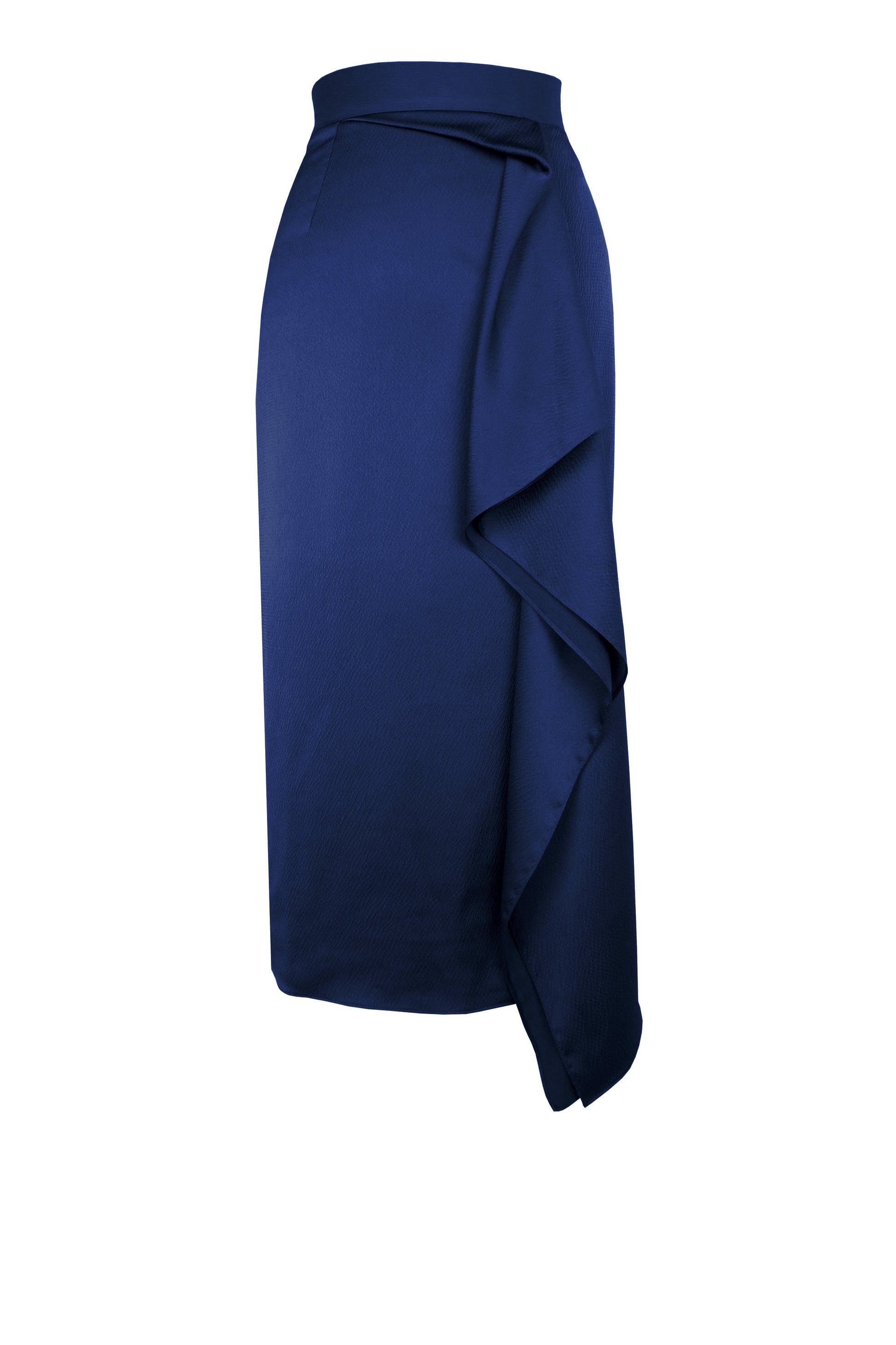 The Flip Midi Skirt has a high waist and pencil skirt body. It features an asymetrical drape at one side that falls into a ruffle.