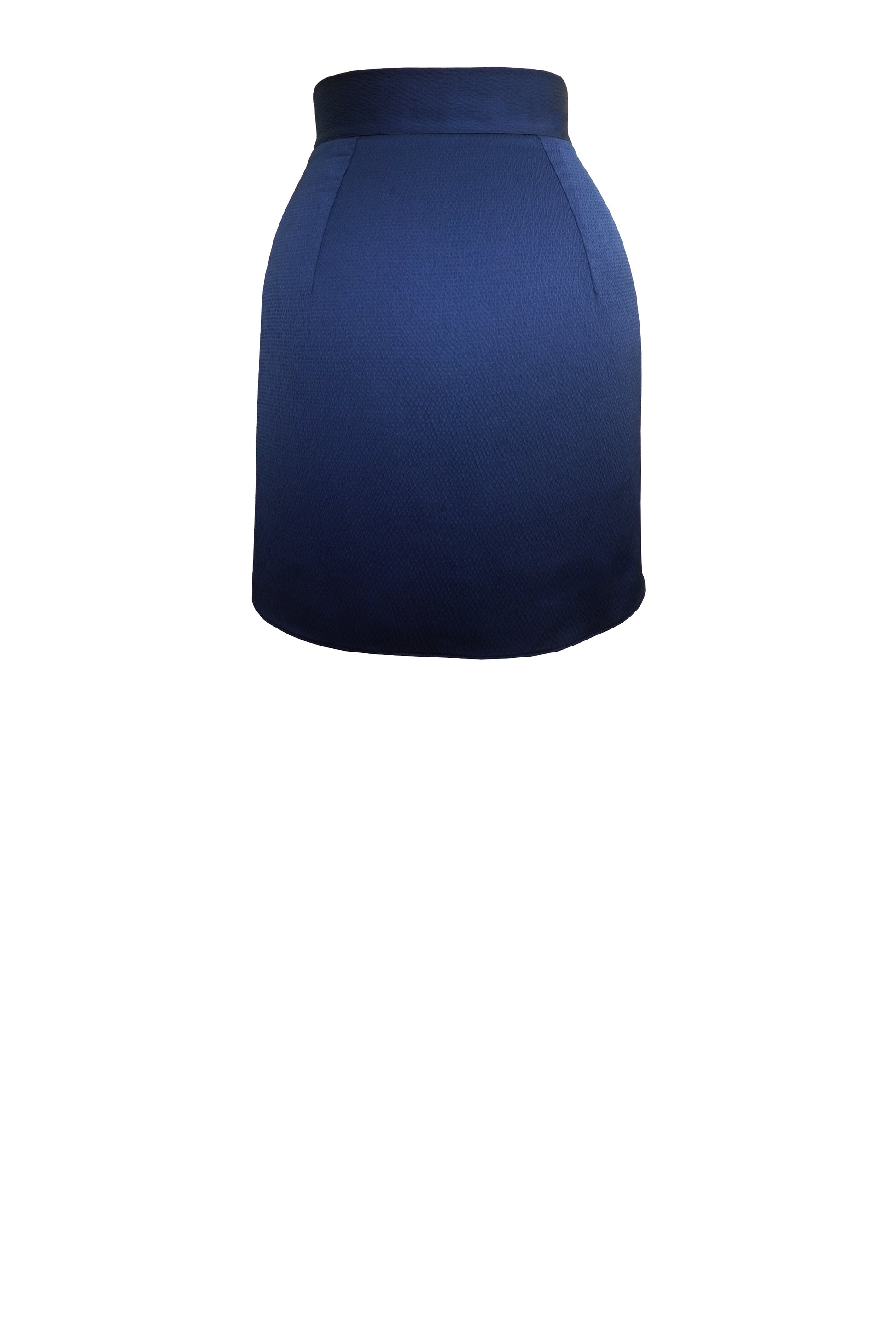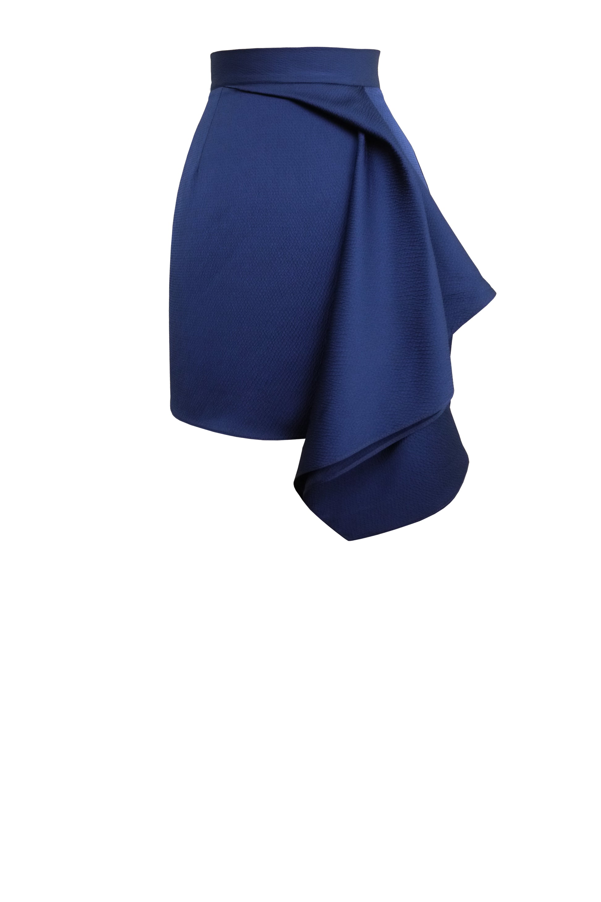 The Flip Mini Skirt is has a high waist and slim body. It features an asymmetrical drape at one side that falls into a ruffle.
