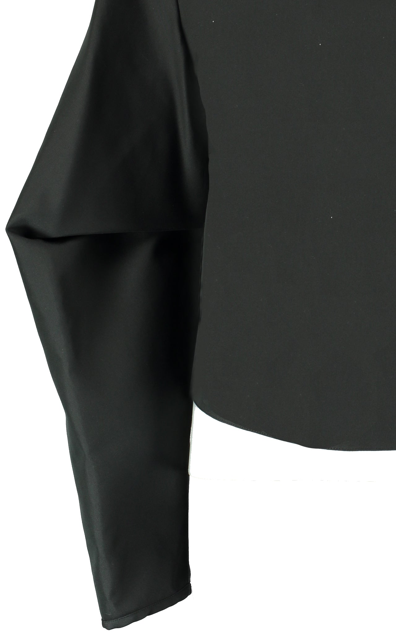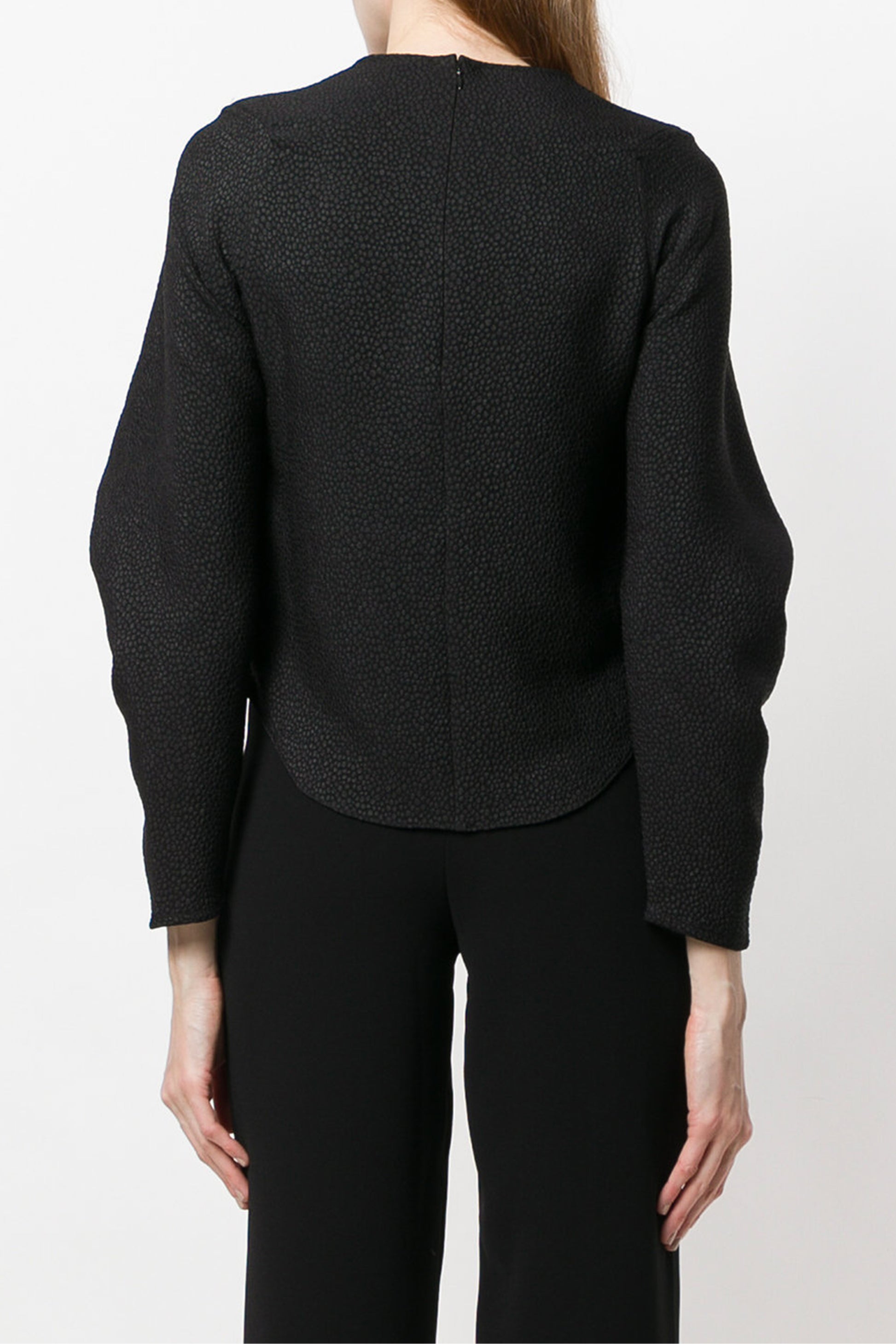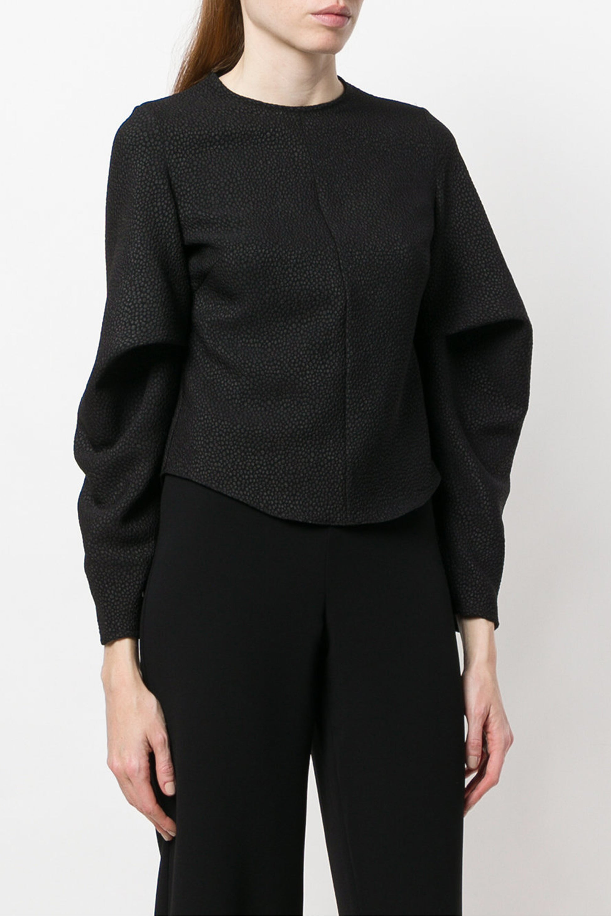 The Floge top is inspired by the mitered corners of an architectural cornice. Intricate cutting on the shoulders emphasize the gently folded drape at the elbows on the sleeve.