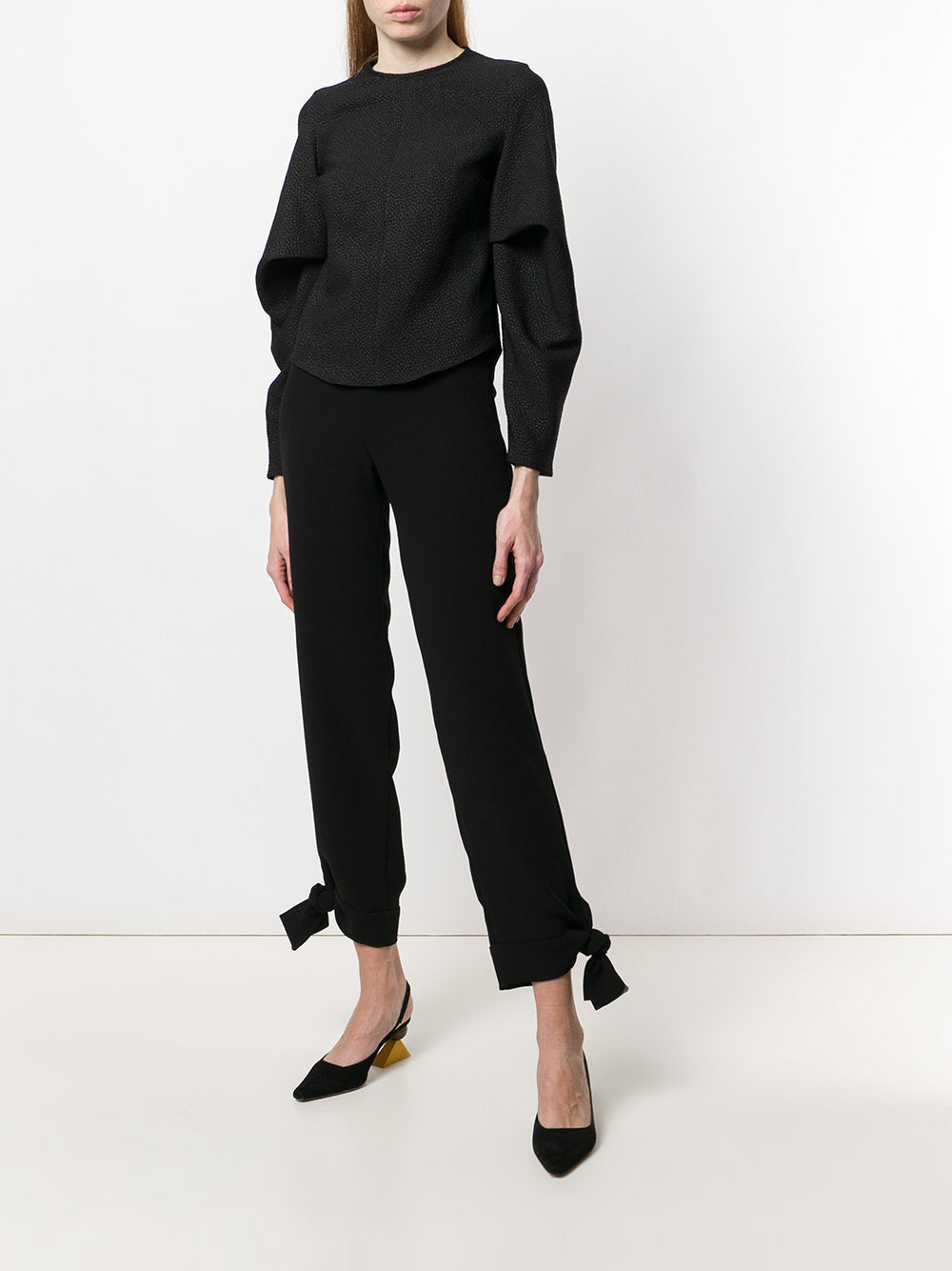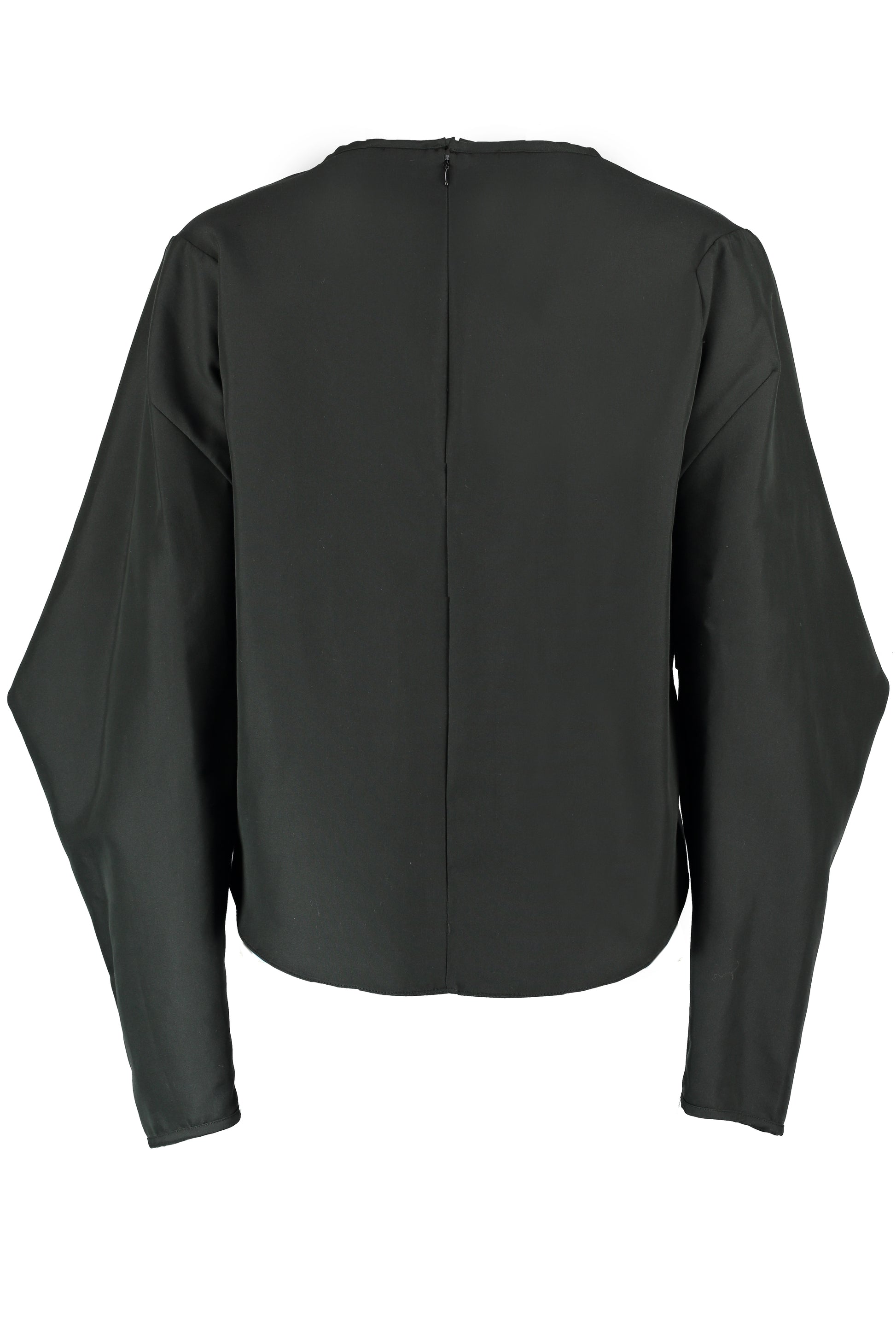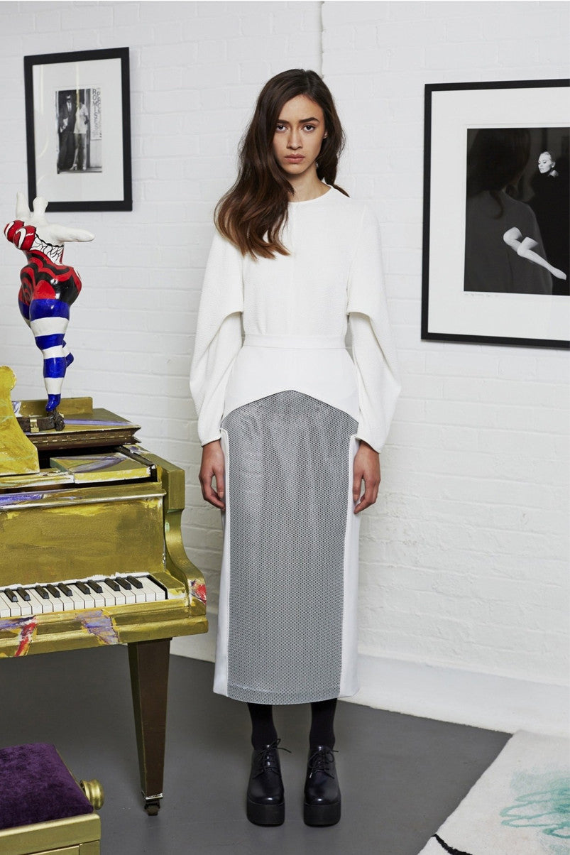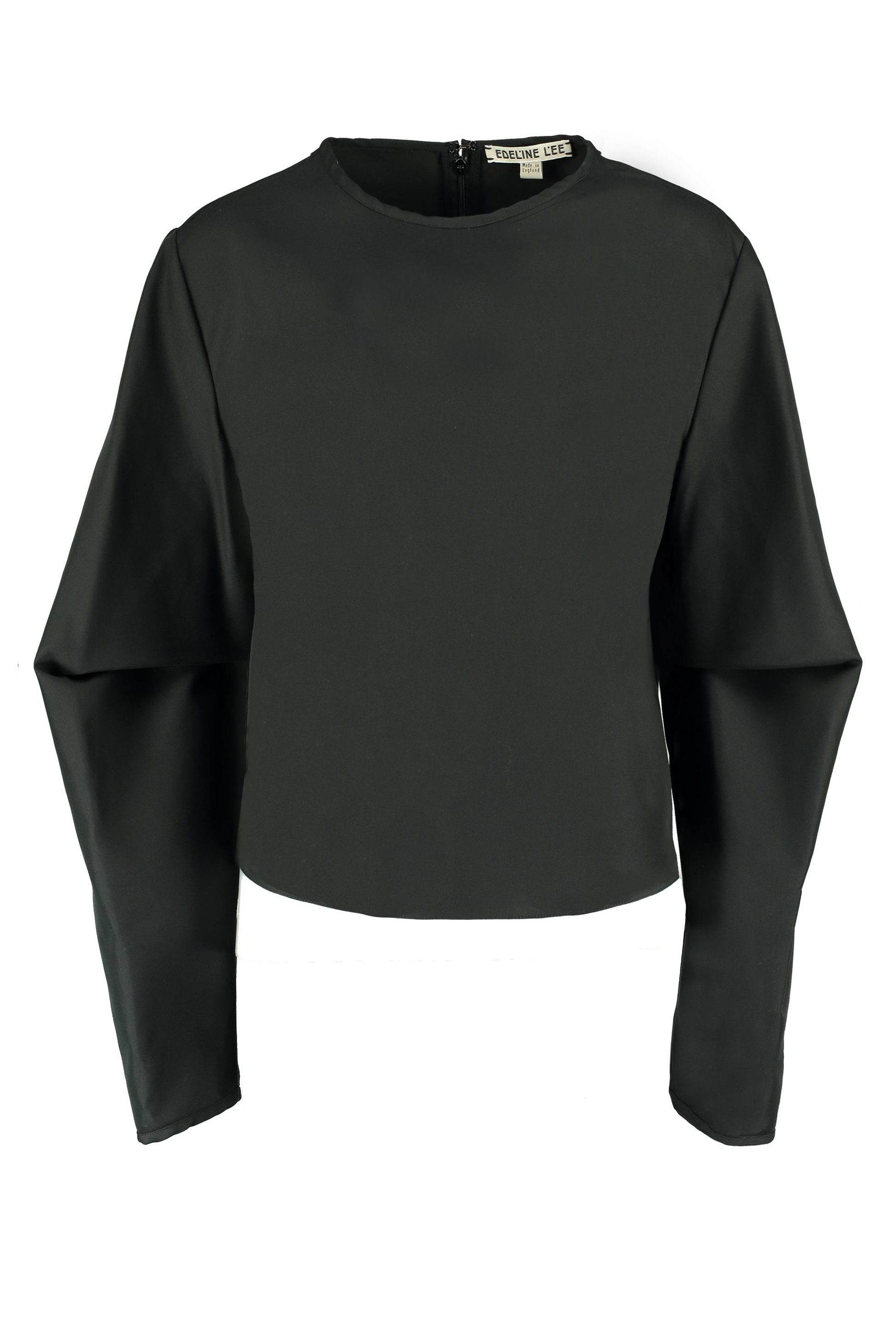 The Floge top is inspired by the mitered corners of an architectural cornice. Intricate cutting on the shoulders emphasize the gently folded drape at the elbows on the sleeve.