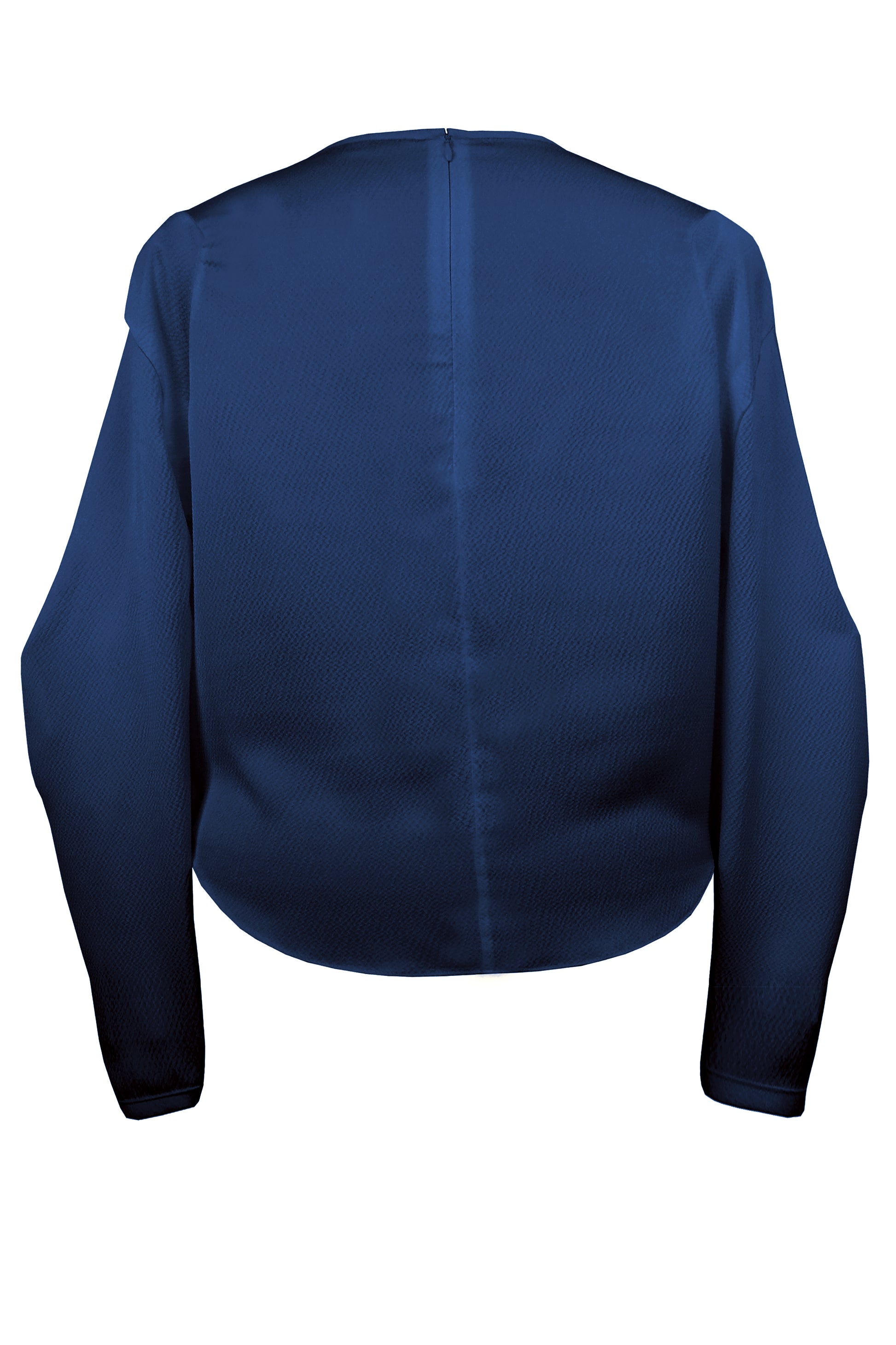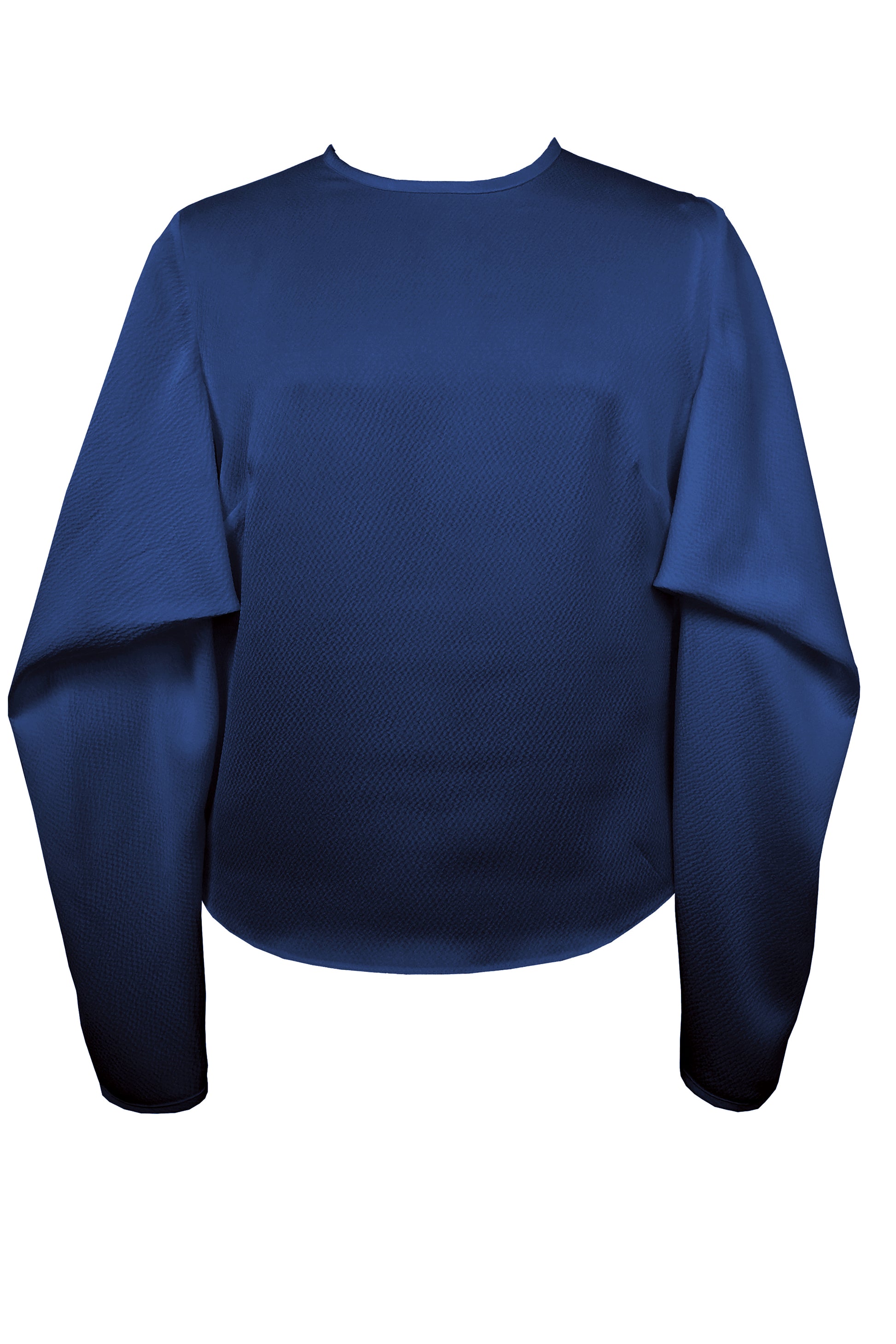 The Floge top is inspired by the mitered corners of an architectural cornice. Intricate cutting on the shoulders emphasize the gently folded drape at the elbows on the sleeve.