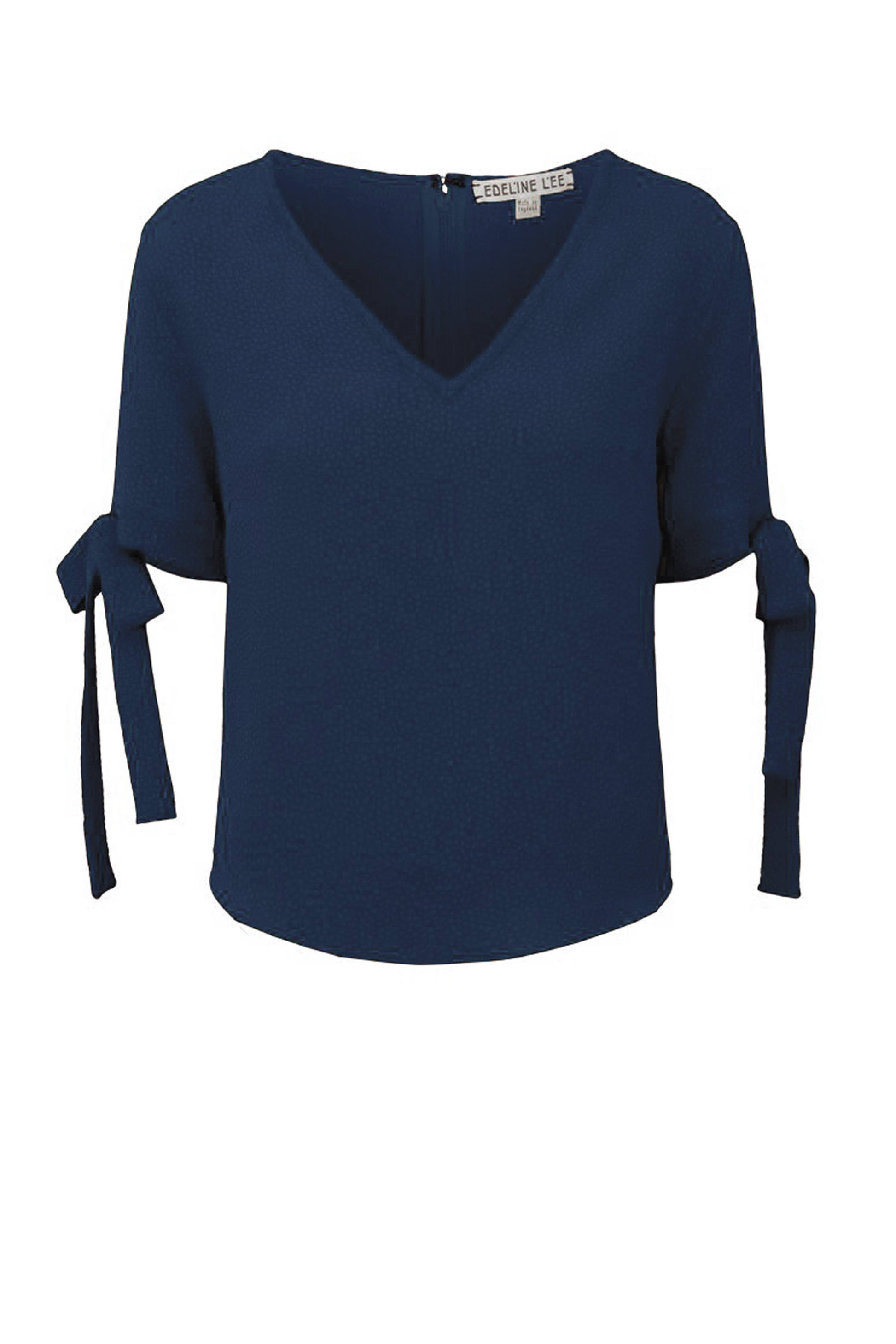The Hestia Top features a V-neck and short sleeves with decorative bows at the cuffs.