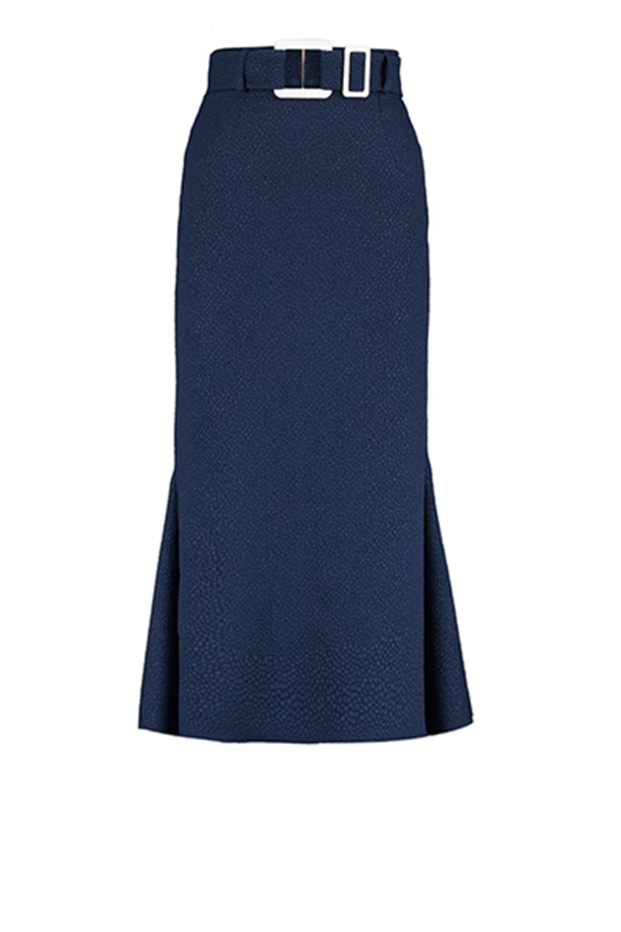 The Invert Skirt features a high rise waist, contrast double buckle belt with Ivory georgette and gold leather and metal details, and a fit and flare midi length silhouette.