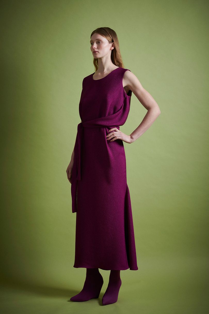 Pair with heels for an elegant evening look or wear untied with flat sandals for a polished day look. The Iris Dress is hand-crafted in England from a pebble-textured Flou Bubble Jacquard woven in Italy. Also available in Purple or Green.