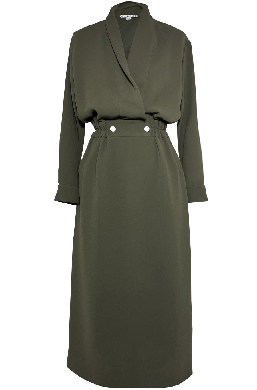 The Iteratio Shirtdress features a wrapped, draped bodice, side pockets and a midi length column skirt. The high rise, elasticated waist has a flat panel at the front decorated with two of our signature hand-covered buttons.