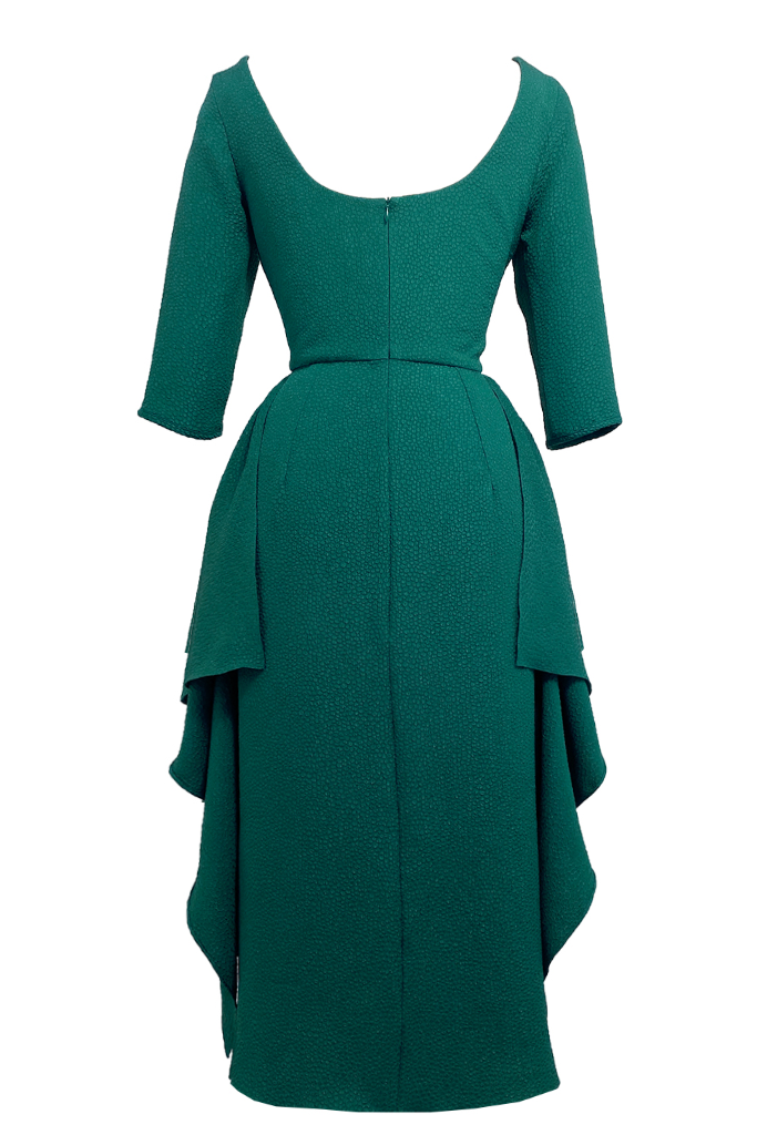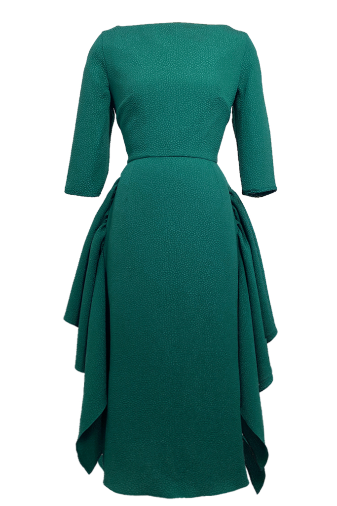 The Jumana Dress features a boat neck, fitted bodice, midi sleeves and a midi length fitted pencil skirt with cascading ruffles along the side seams.