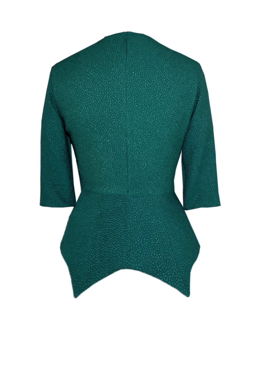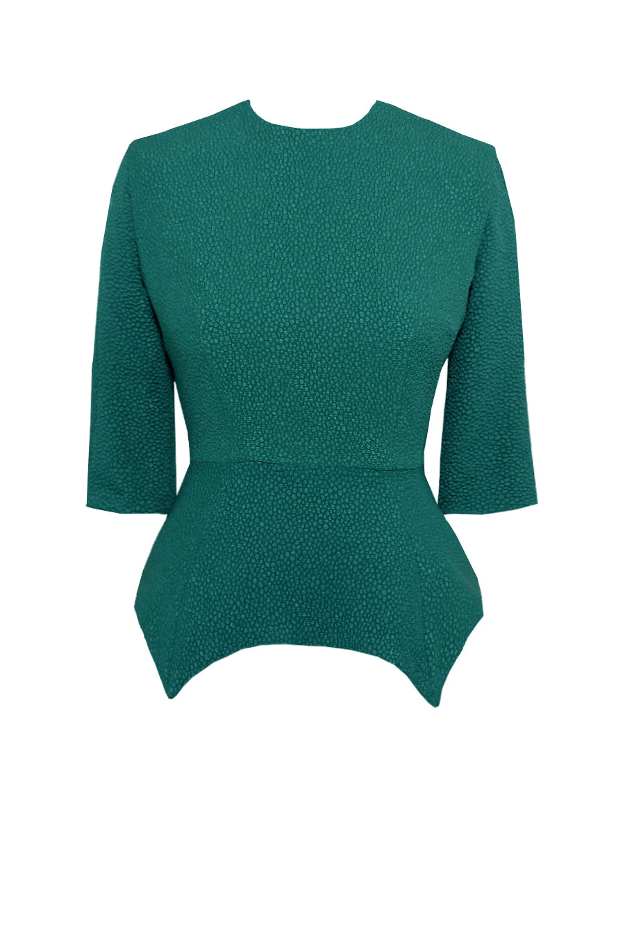 The Jupiter Top features a tailored, fitted bodice, high neck, short sleeves as well as a shaped sculptural peplum at the hem.