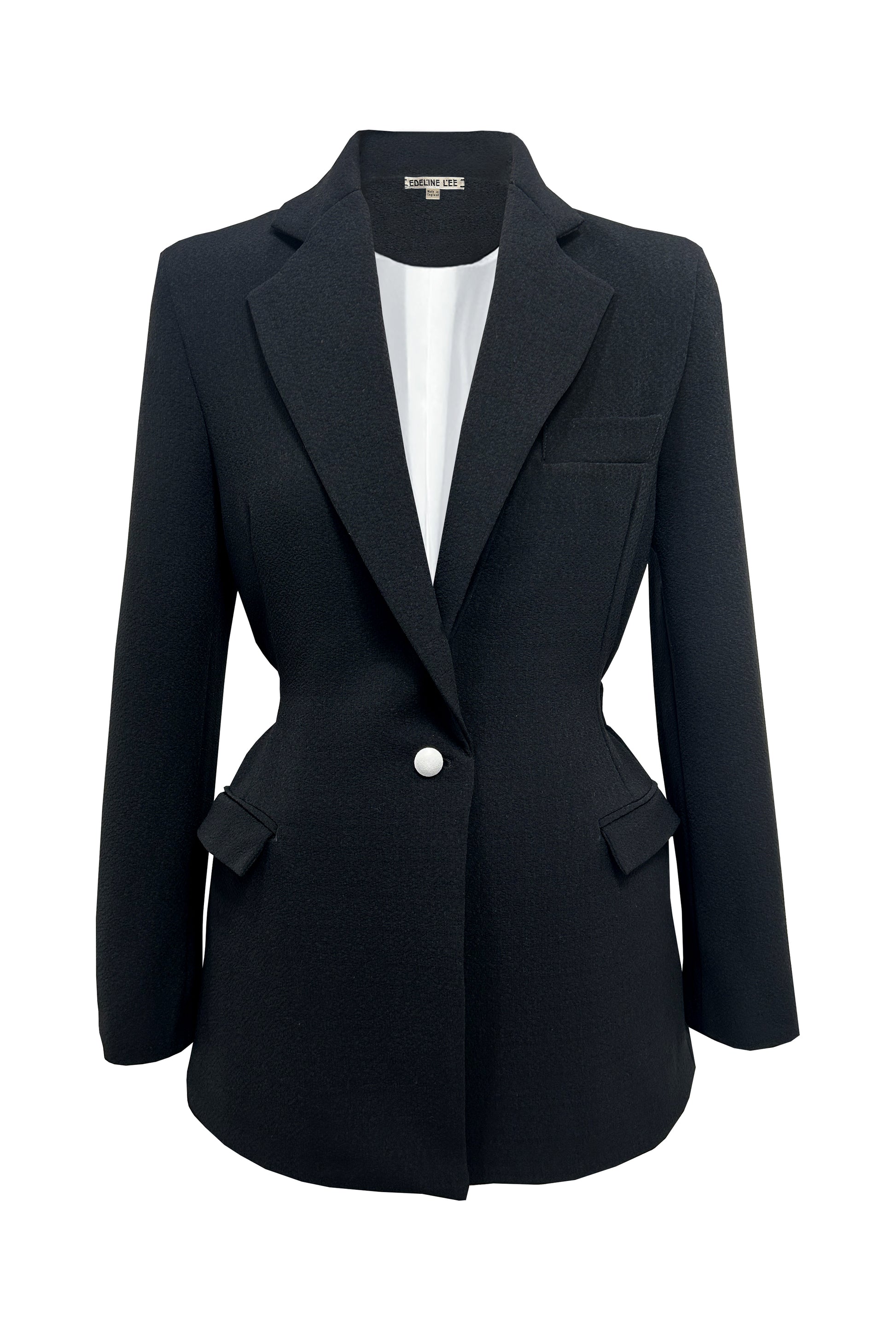 The Lola Jacket features a slim cut, high notched lapel and welt pockets. The waist is cinched at the back with ruching forming a flattering peplum. Finished with a signature hand-covered button.