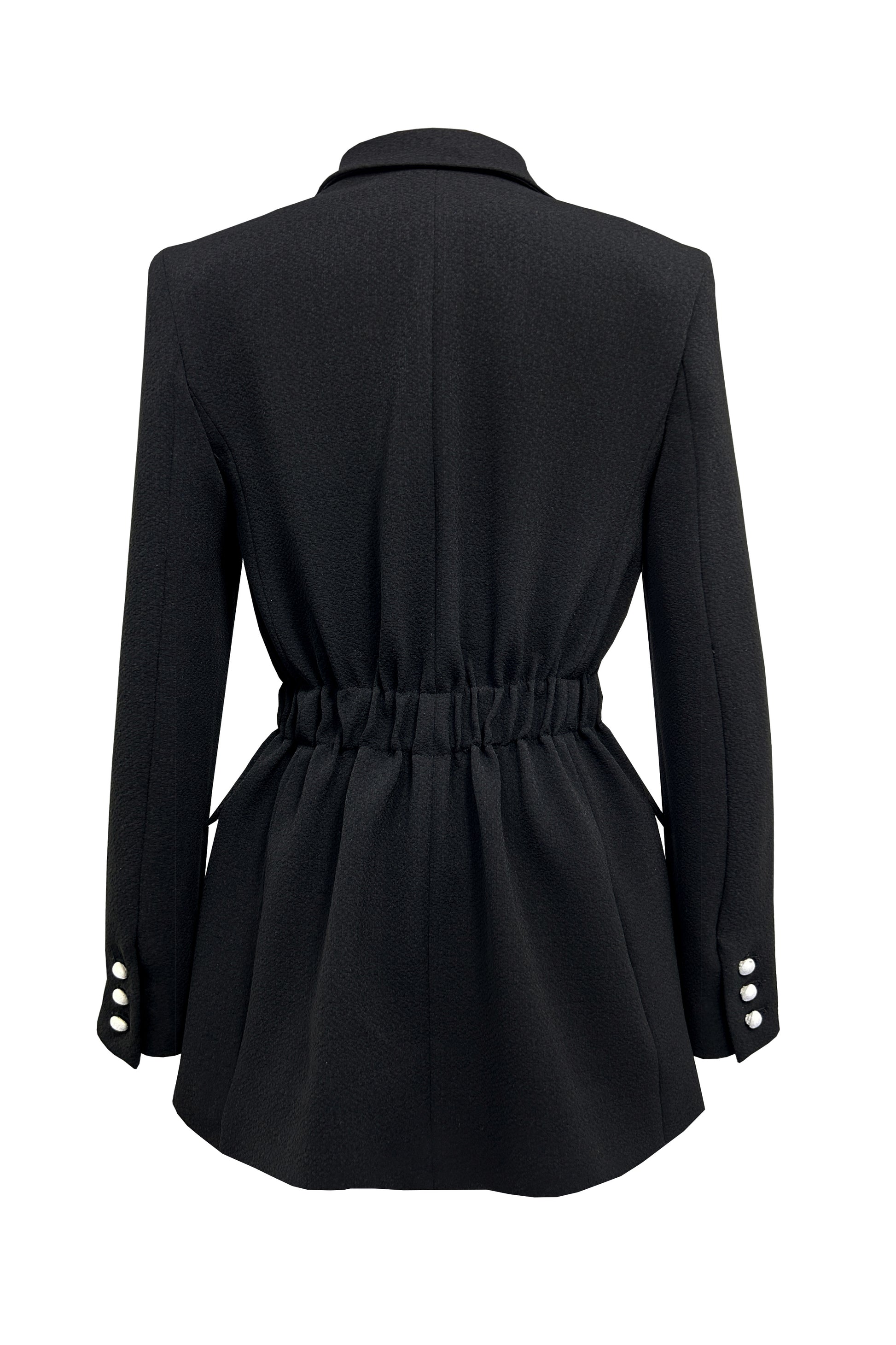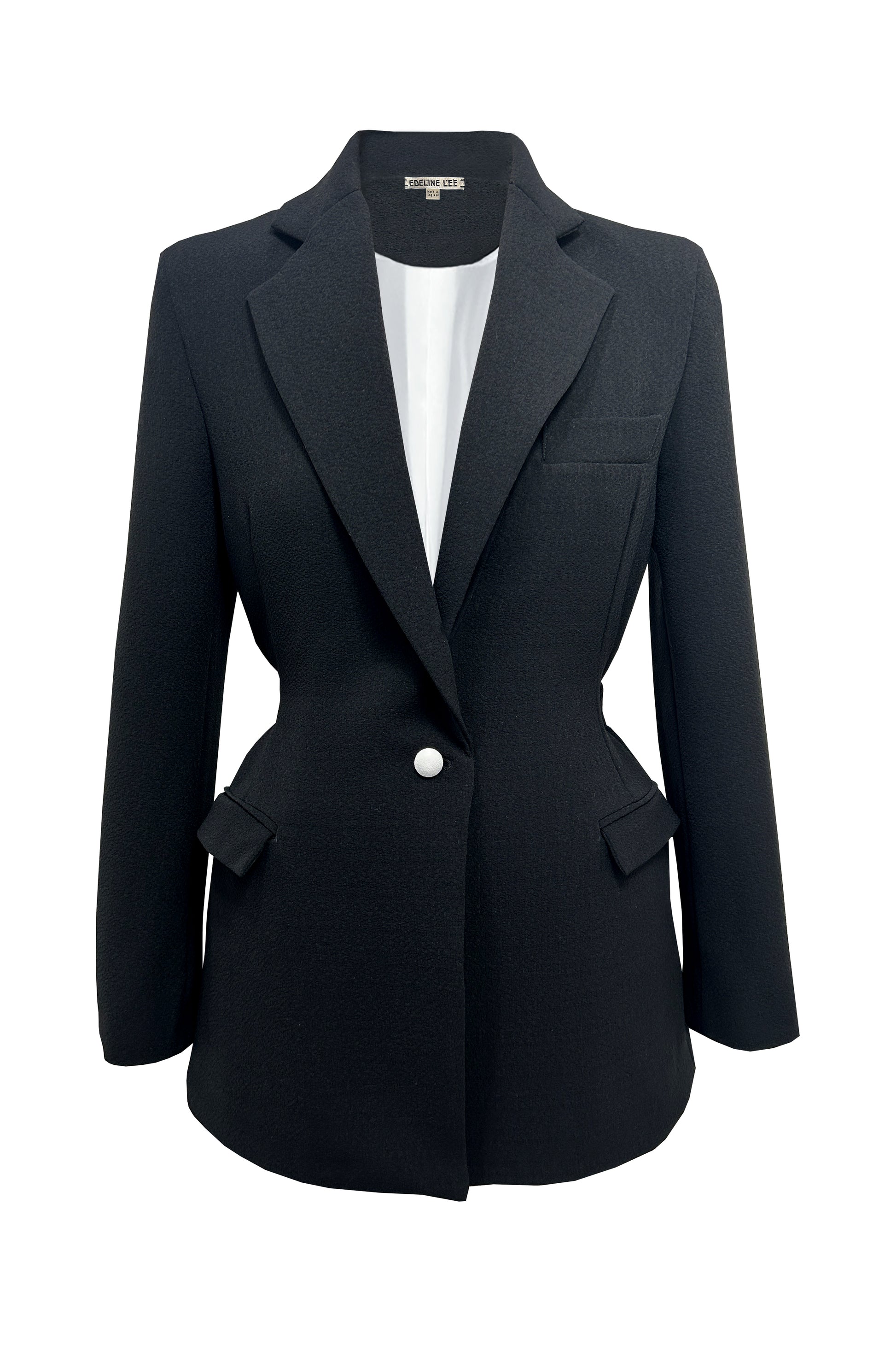 The Lola Jacket features a slim cut, high notched lapel and welt pockets. The waist is cinched at the back with ruching forming a flattering peplum. Finished with a signature hand-covered button.