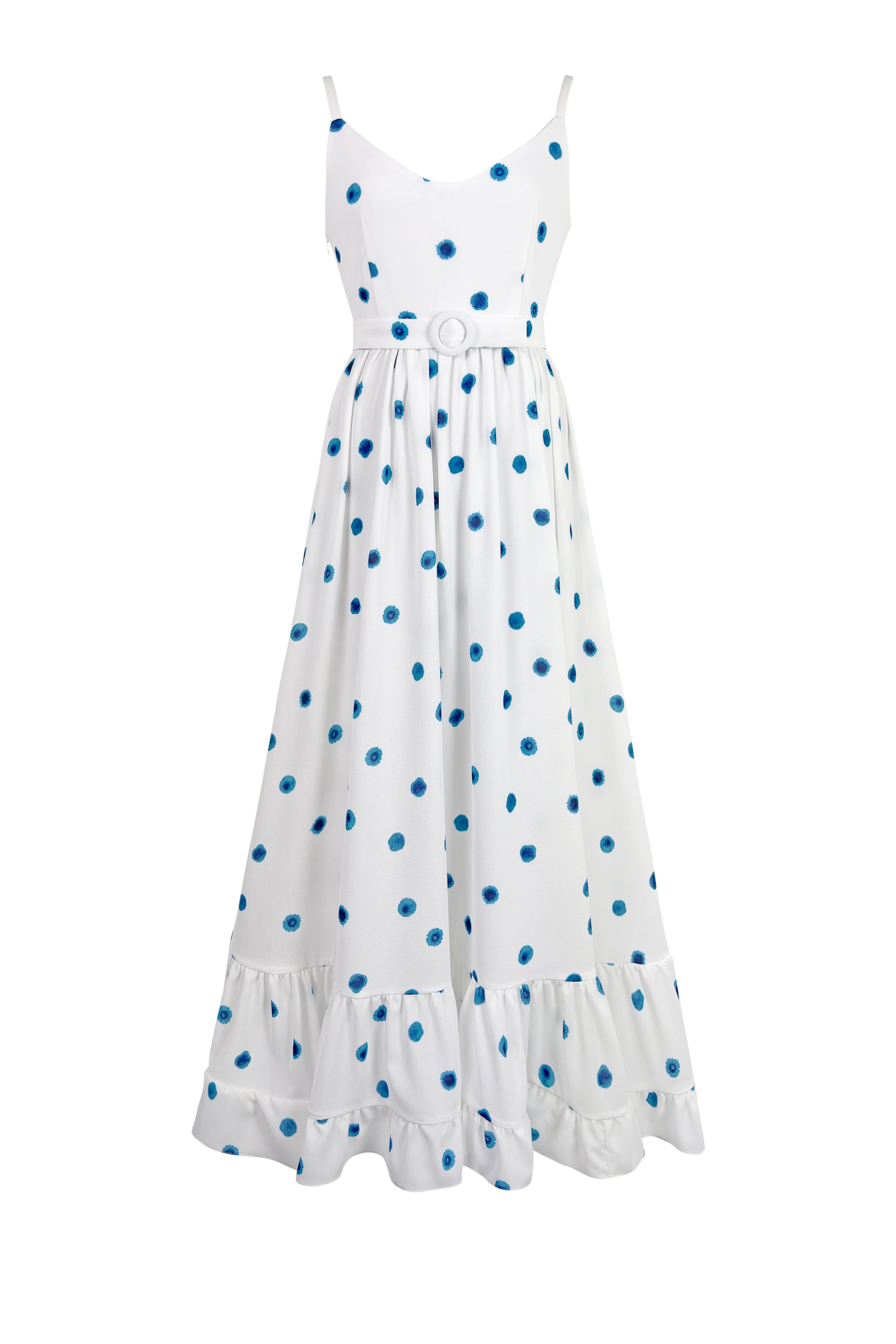 The Olivier Dress features thin straps, and a fitted U neck bodice. The gathered skirt is crop length and features two tiers of ruffles at the hem. The dress is finished with a removable belt with our signature hand-covered buckle.