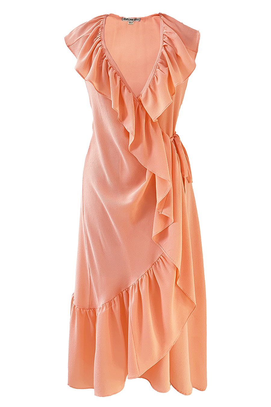 The Orbit Dress is an elegant wrap dress that can be fastened to be fitted either tightly or loosely at the waist with a bow. The dress features asymmetrical, flowing ruffle details, all around the neckline and continuing around the hemline. This is a perfect day to night dress that can be worn for a sunny day on holiday or dressed up for an evening event.