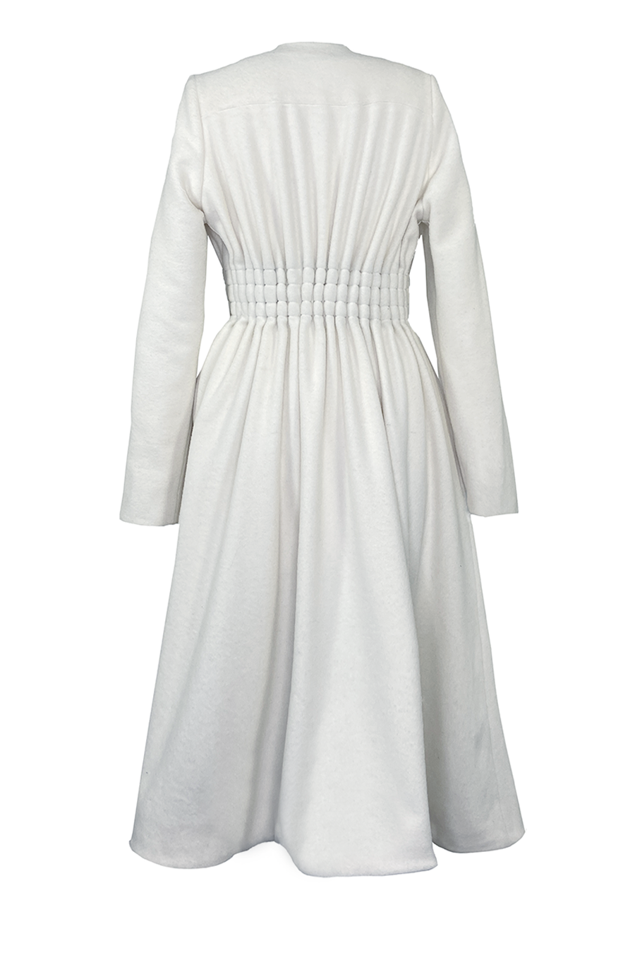 The Pallas Coat fits snugly on the shoulders, drawn in with heavy bullet pleating. It is finished with a chunky tie belt and concealed internal buttons. The coat has a clean collarless neckline and flares out below the waist to create a beautifully elegant silhouette.