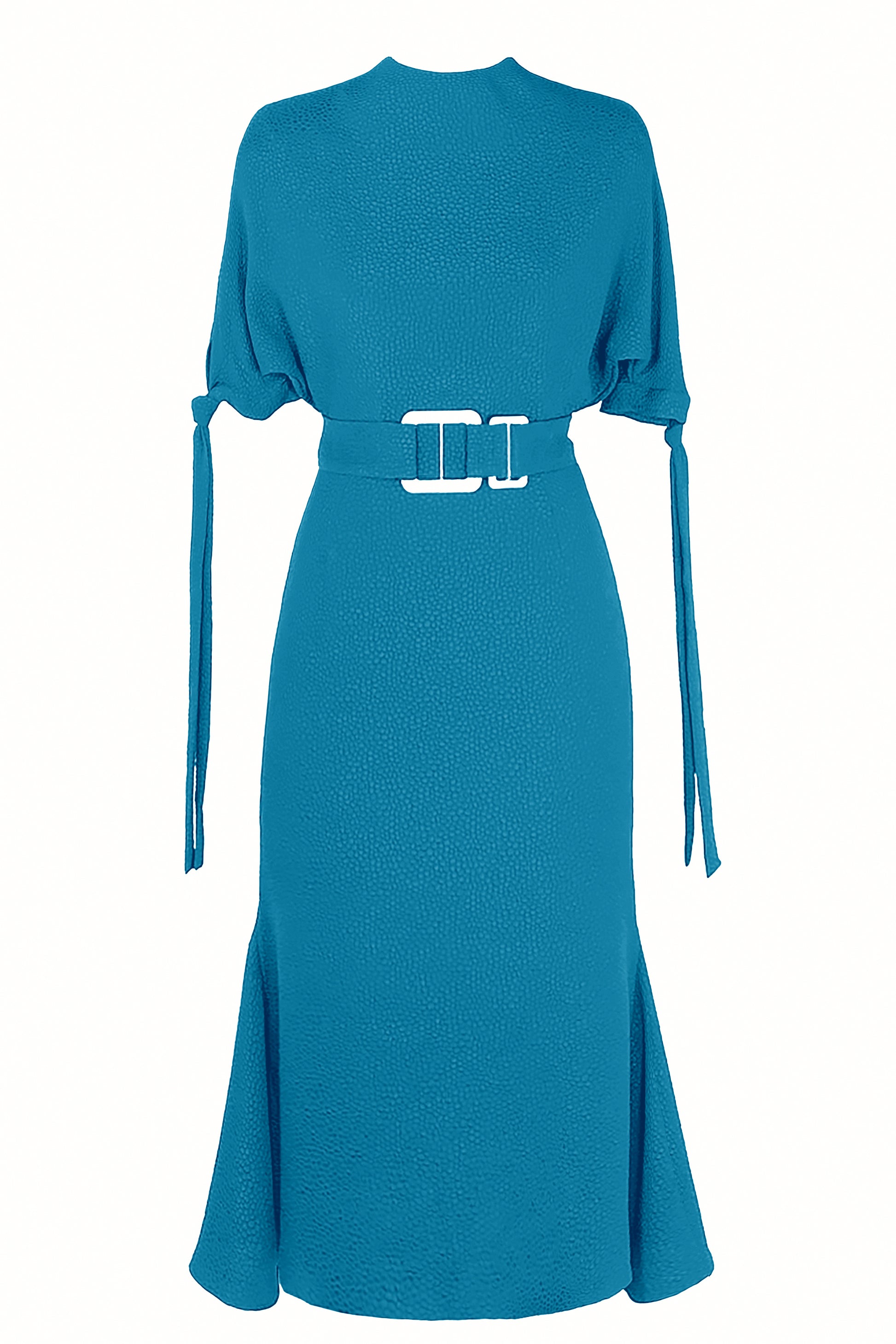 High Draped Neck Dress with Dropped Shoulders, Tie Detail Sleeves and Fitted Flare Skirt