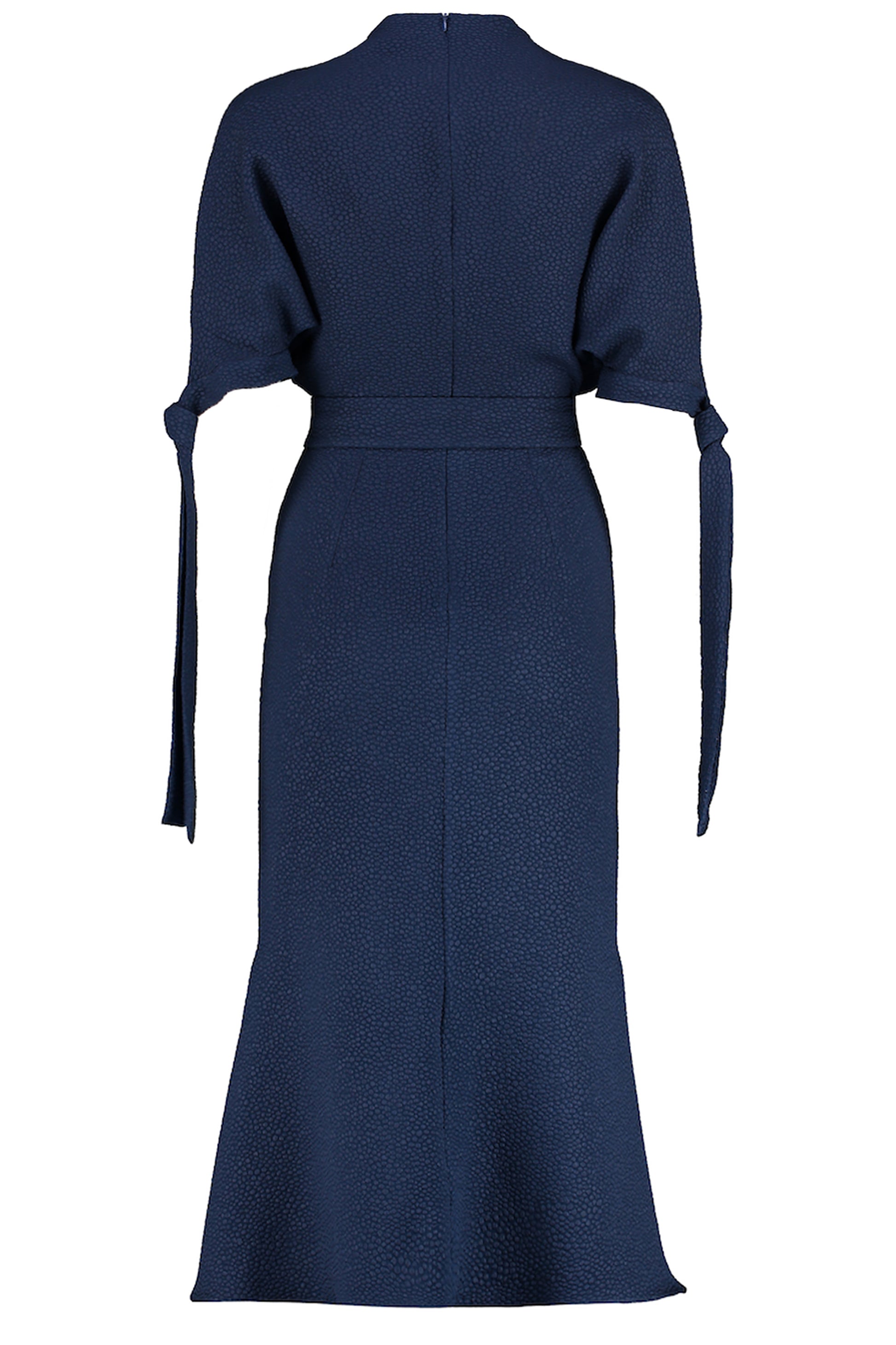 High Draped Neck Dress with Dropped Shoulders, Tie Detail Sleeves and Fitted Flare Skirt