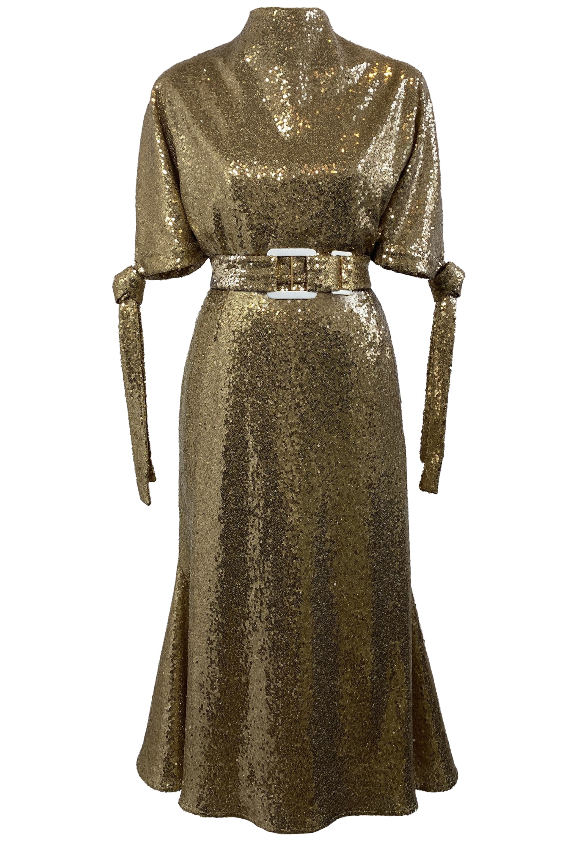 The Pedernal Dress has ease and elegance to its fit, with a loose fitting bodice, high neck, and an adjustable tie closure at the elbow. The skirt has a slim line that flares at the midi-length hem. Also features a removable self belt with snap closure and Italian hand-covered Ivory Georgette Champion buckle with gold hardware.