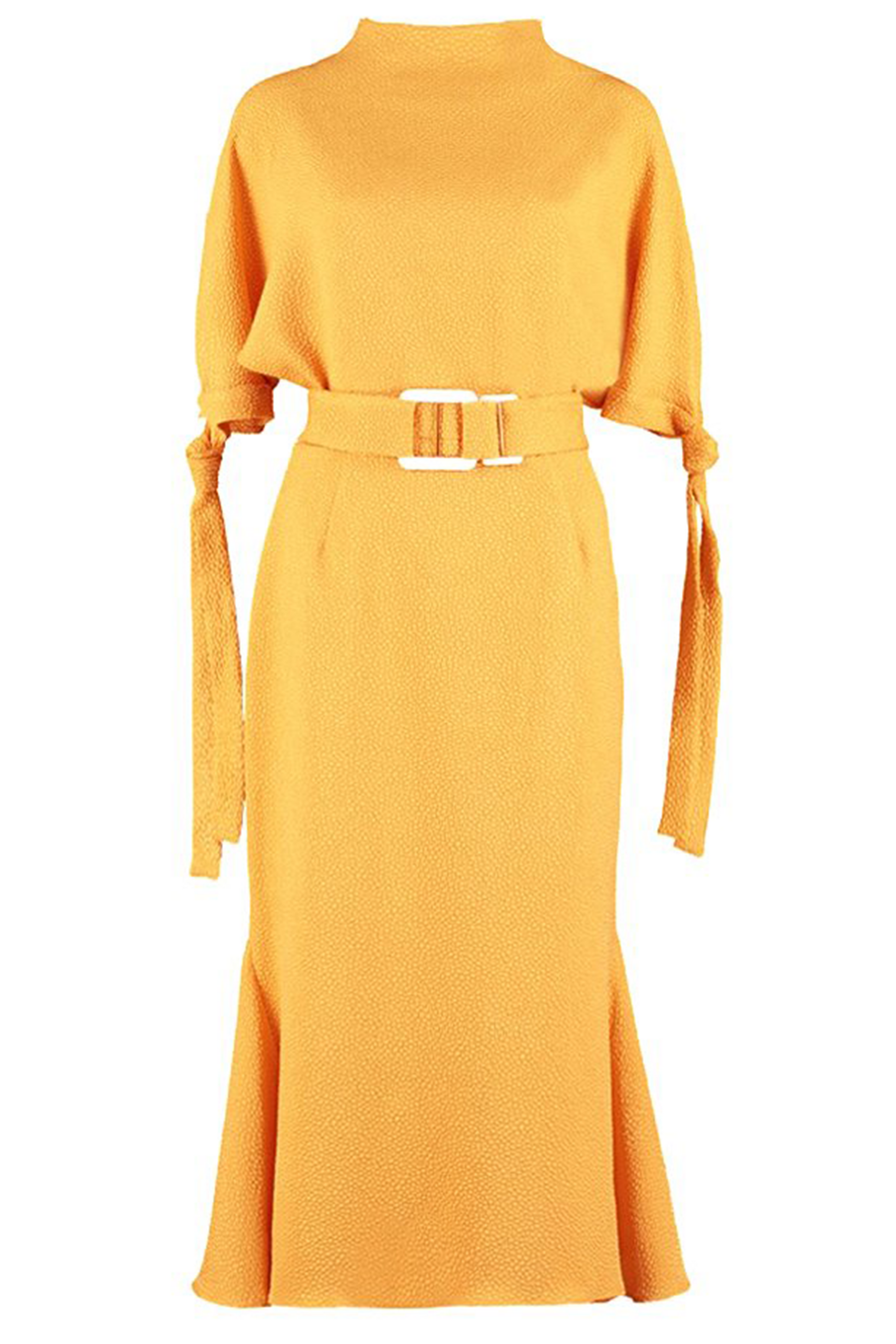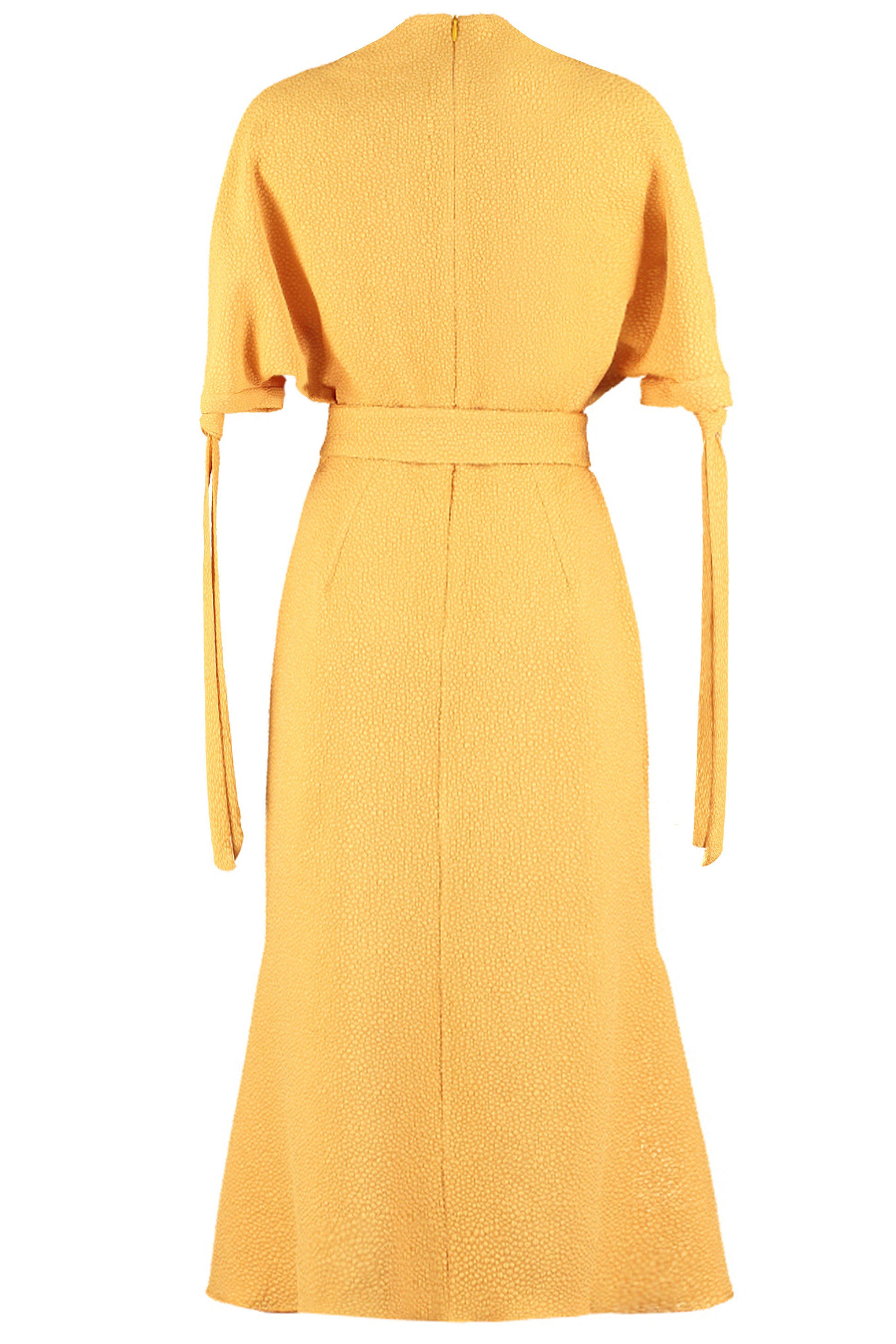 High Draped Neck Dress with Dropped Shoulders, Tie Detail Sleeves and Fitted Flare Skirt