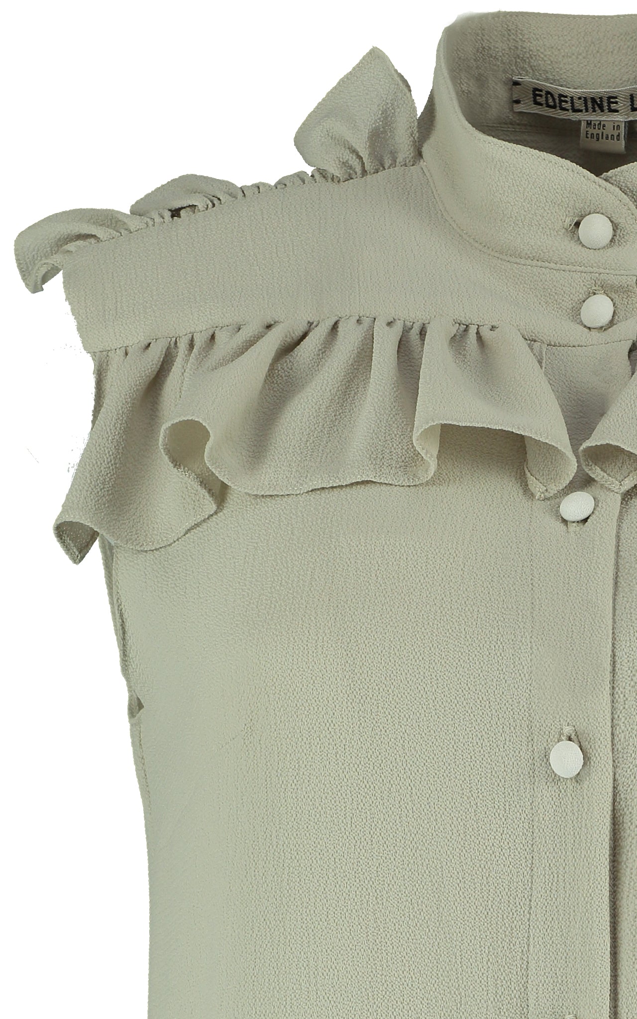 The Penelope Sleeveless Shirt features a mandarin collar, front button placket, and a charming ruffle detail across the front, back and along the shoulder.
