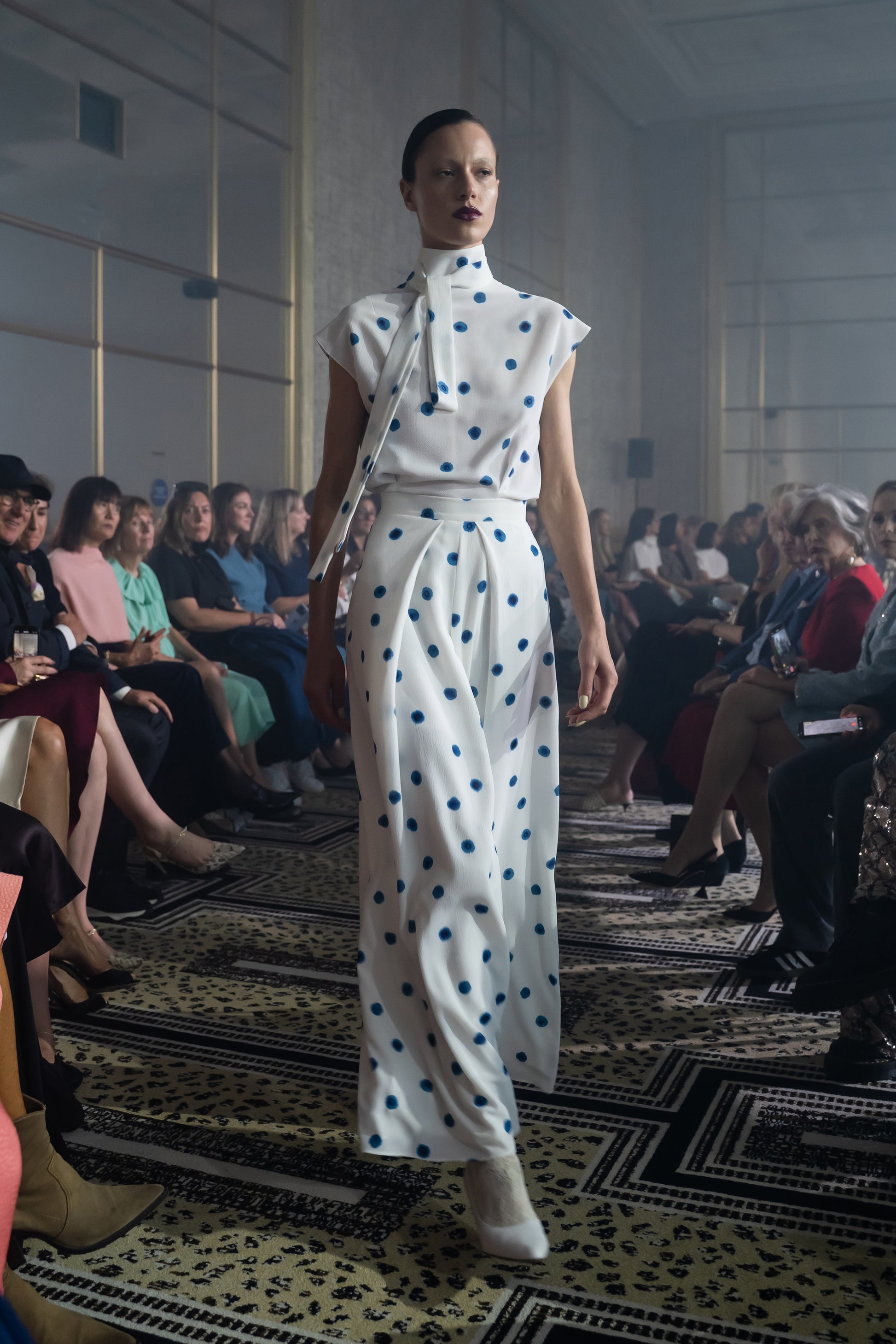 The Ribbon Neck Blouse has a slightly oversized fit and features a tailored turtleneck and a long looped scarf at the neck that can be tied into a graceful bow. The blouse has delicate dart details at the shoulder and waistline and armholes that drape into a slightly capped sleeve.