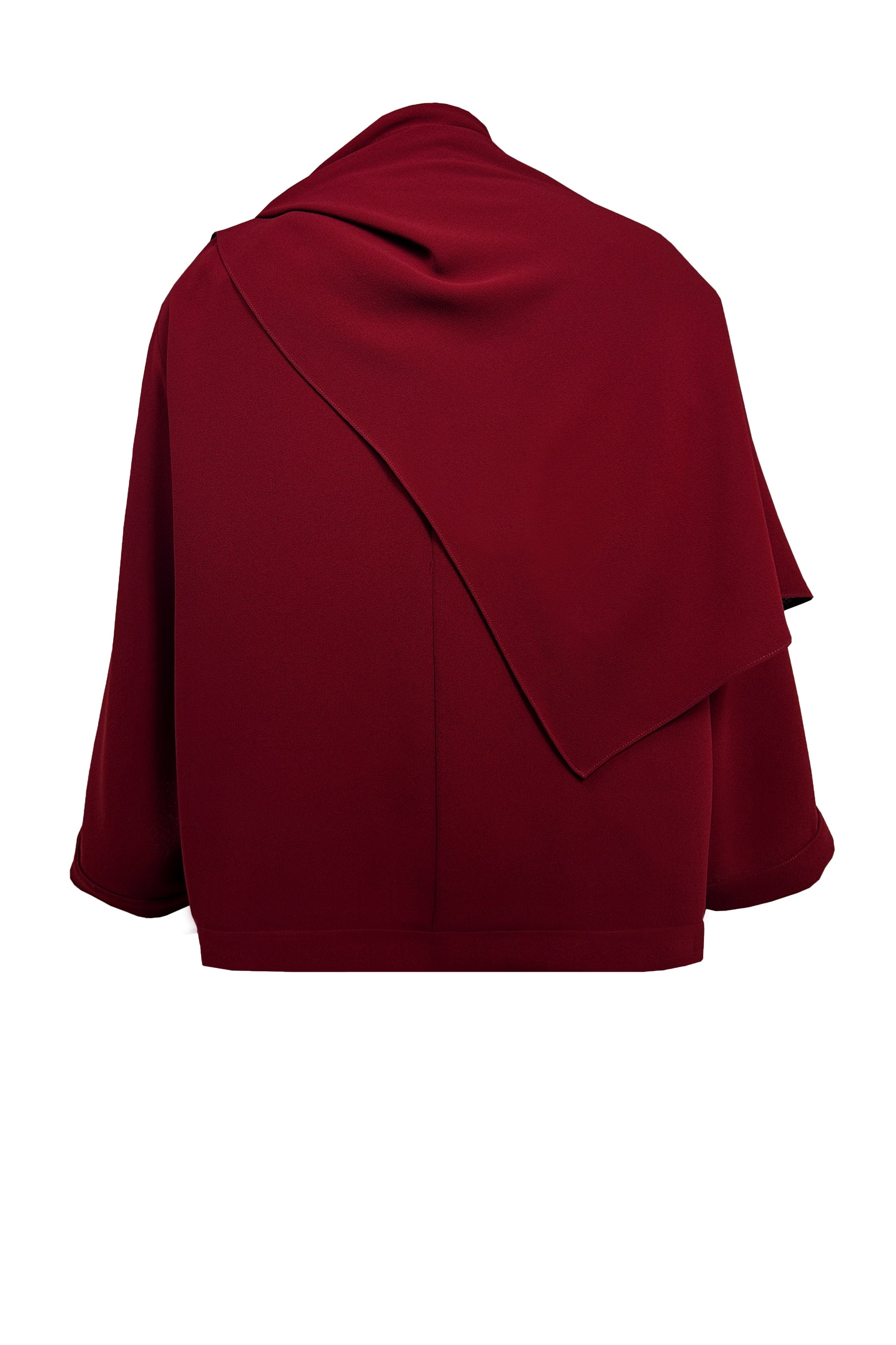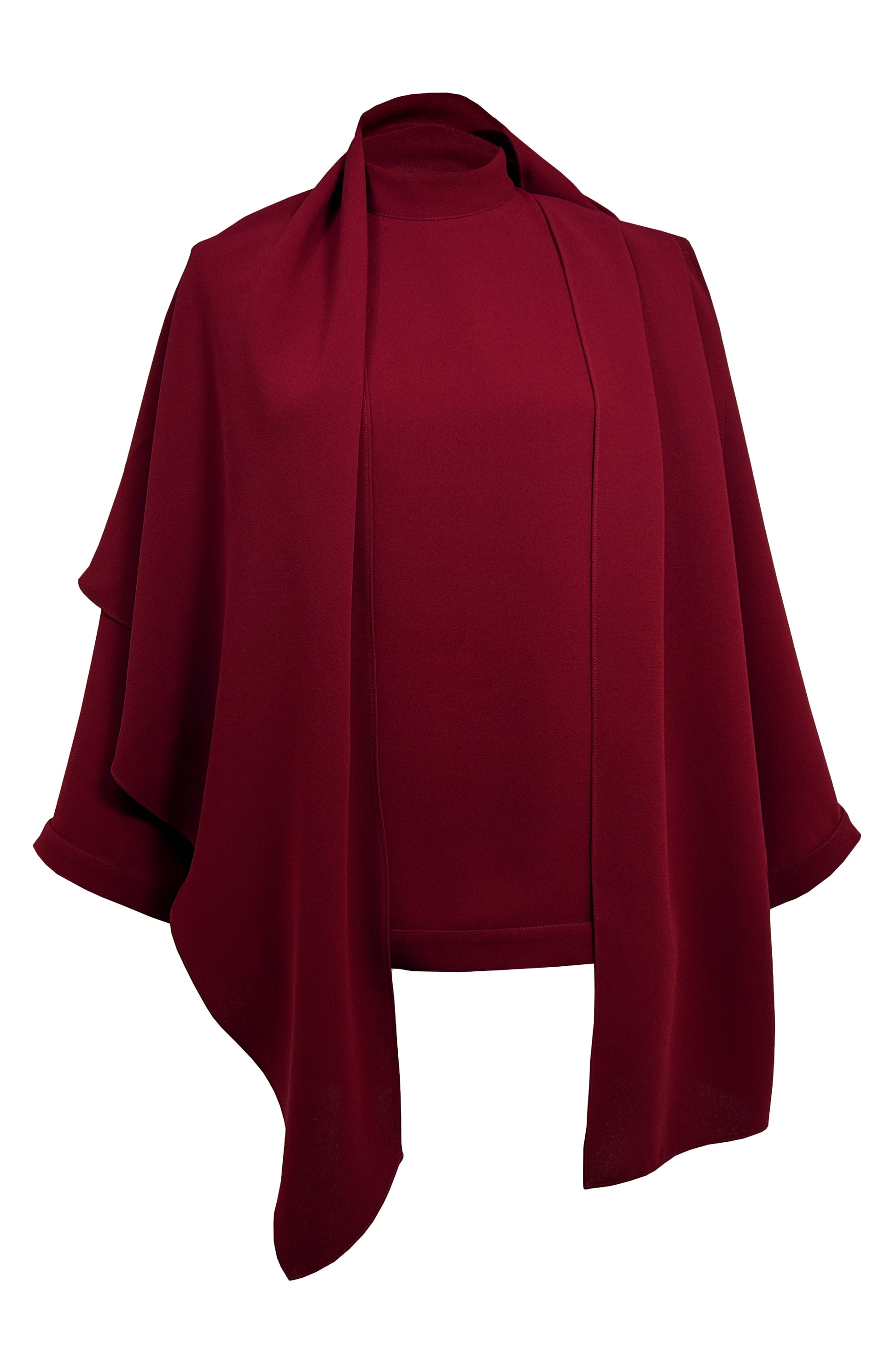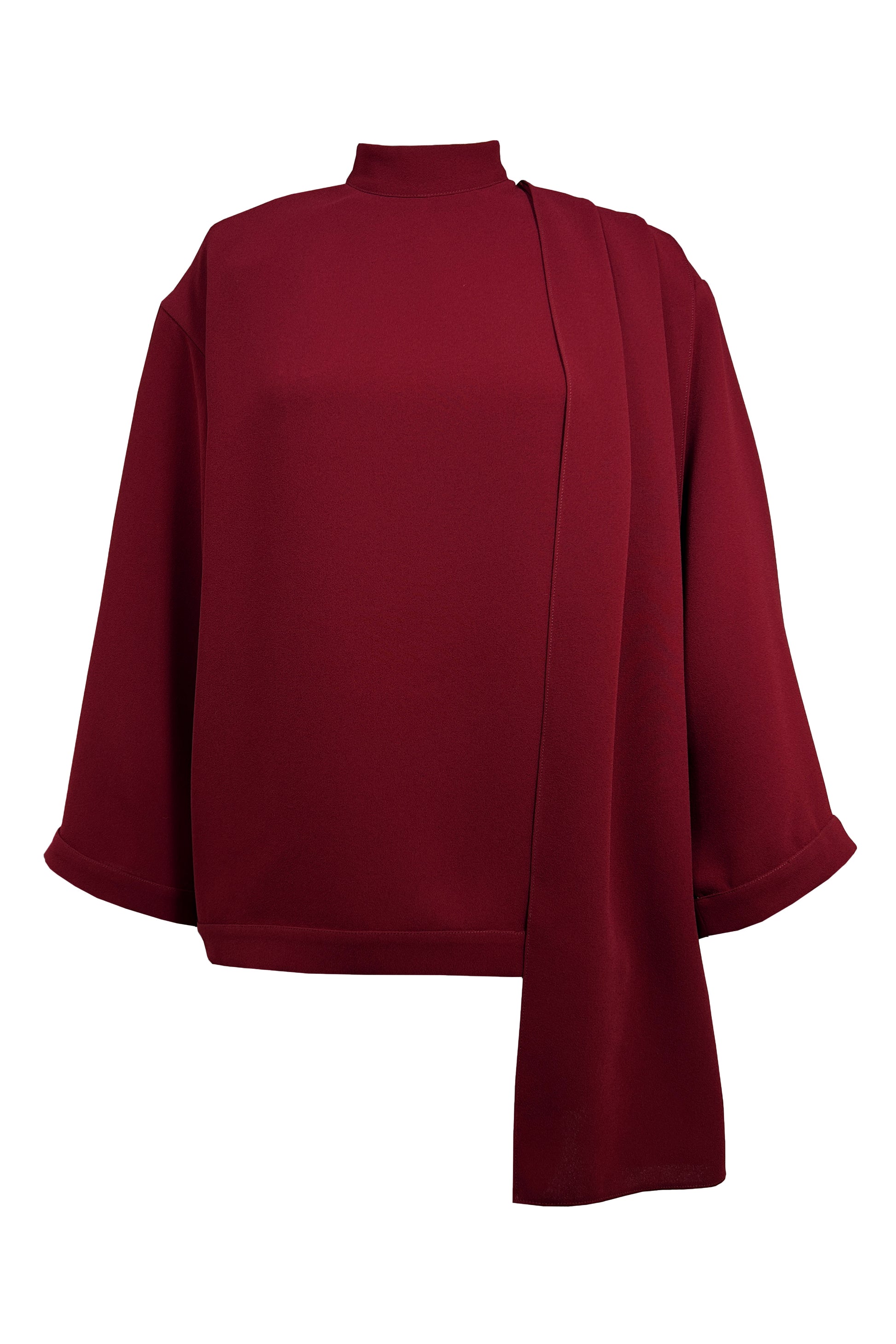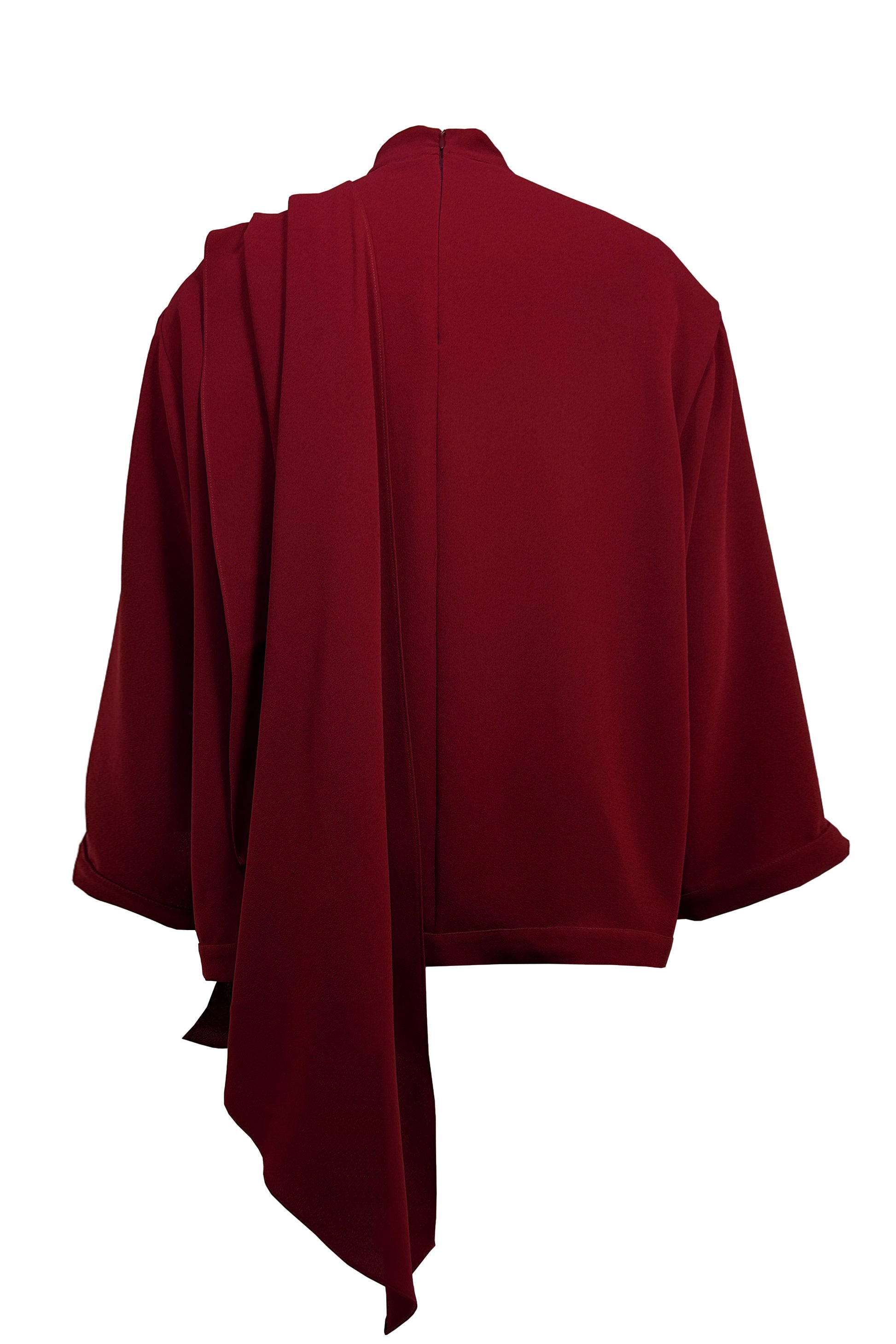 The Scarf Top has an oversized fit with a mock neckline and cuff details. Draped scarf panels hang from the shoulders which can be worn loose or draped over the shoulders.