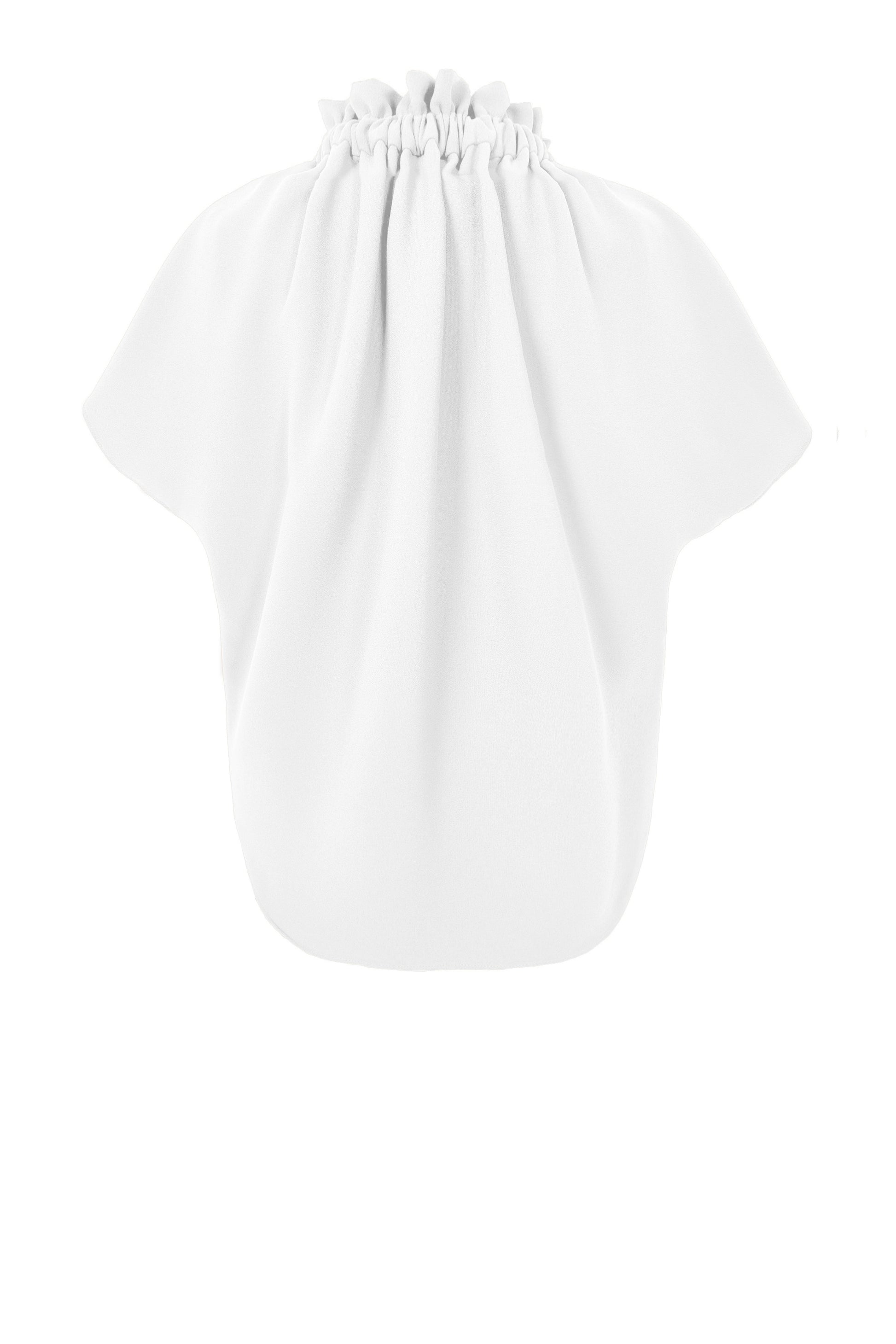 The Short Ruff Blouse features an elegant elasticated ruff neckline with draped short sleeves and a curved hem. The ruff at the neck is truncated and shorter than our classic Ruff Blouse, creating a playful, neck-elongating alternative for our Ruff Blouse customer.